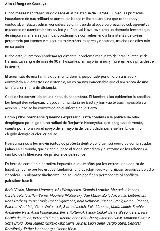 Esta es la carta que acaban de dar a conocer desde la comunidad judía mexicana (con algunas queridas amistades entre quienes firman), a sabiendas de que las que se erigen como sus autoridades o figuras de referencia, recurrirán a la censura, las majaderías, las sanciones y las acusaciones de traición.