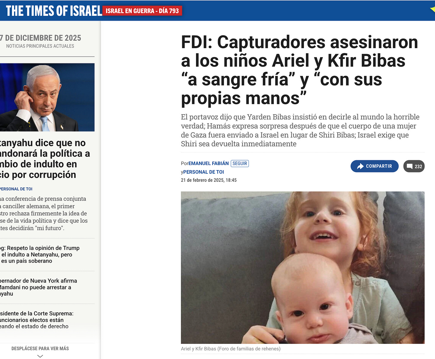 “Contrariamente a las mentiras de Hamás, Ariel y Kfir no murieron en un ataque aéreo. Ariel y Kfir Bibas fueron asesinados por terroristas a sangre fría. Los terroristas no dispararon a los dos niños, sino que los mataron con sus propias manos desnudas. Posteriormente, cometieron actos atroces para encubrir estas atrocidades.”