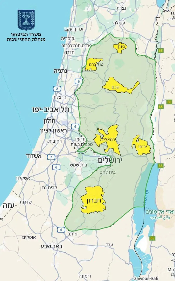 El 25 de septiembre, Smotrich presentó el mapa de sus planes de anexión de al menos el 82% de Cisjordania (área verde), con la exigencia de expulsar a los pobladores palestinos. El 18% restante del territorio (bolsones en amarillo) sería “gestionado” por la Autoridad Nacional “hasta que se encuentre una alternativa para reemplazarlos con otro sistema de gobierno”.