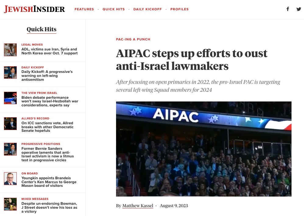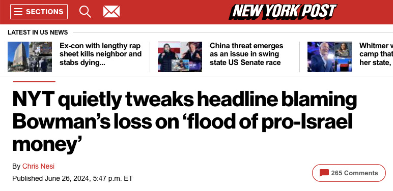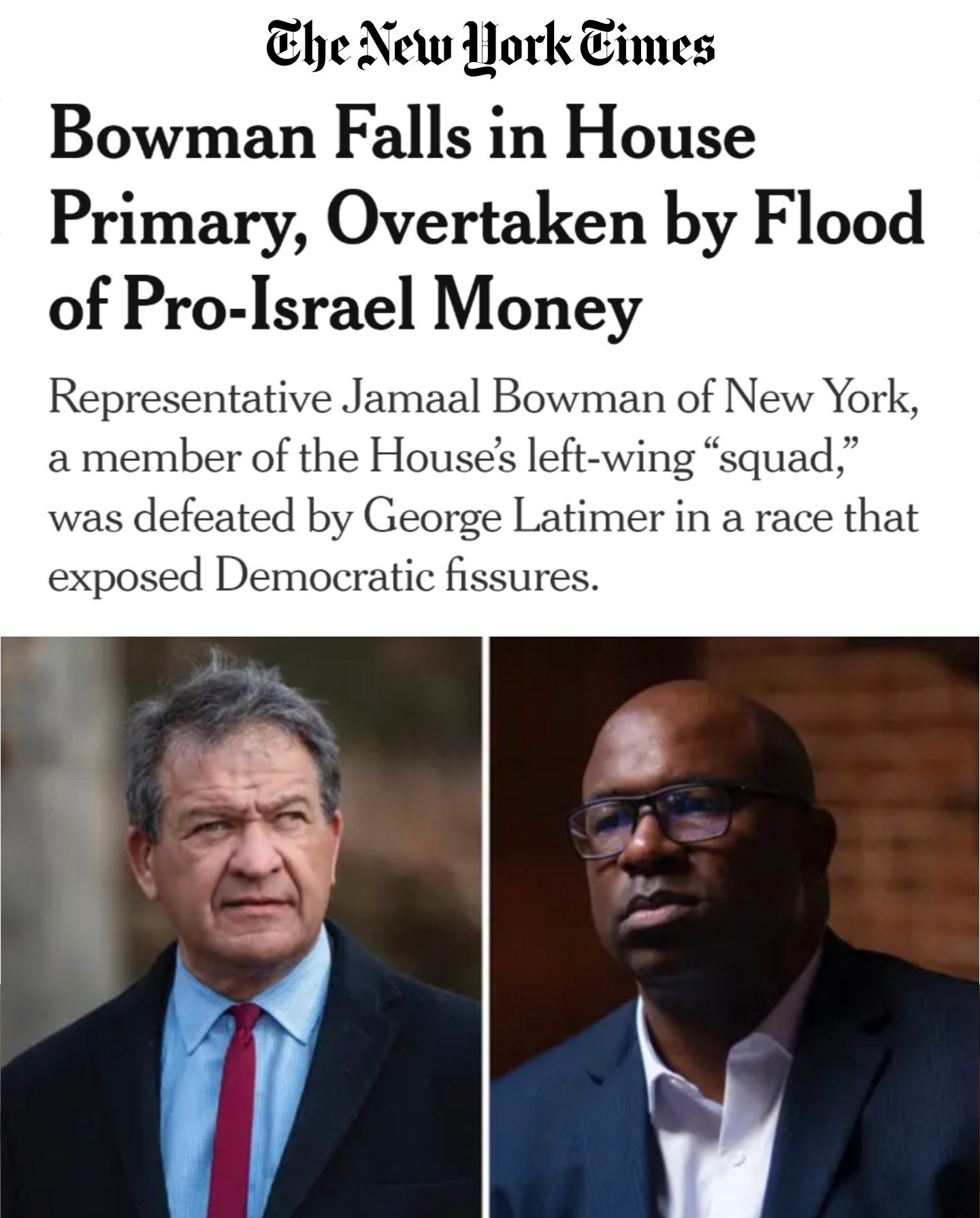 El New York Times entendió lo que había pasado pero fue descubierto en una maniobra para disimular el papel de AIPAC en esta maniobra: el primer titular de su noticia decía “Bowman cae en las primarias de la Cámara, superado por una avalancha de dinero pro-Israel”; tras una oleada de críticas del campo favorable a Netanyahu, lo cambió por “Bowman cae ante Latimer en una pérdida para los demócratas progresistas”. Contra la práctica tradicional del propio diario, el Times no añadió una nota del editor explicando el reemplazo.