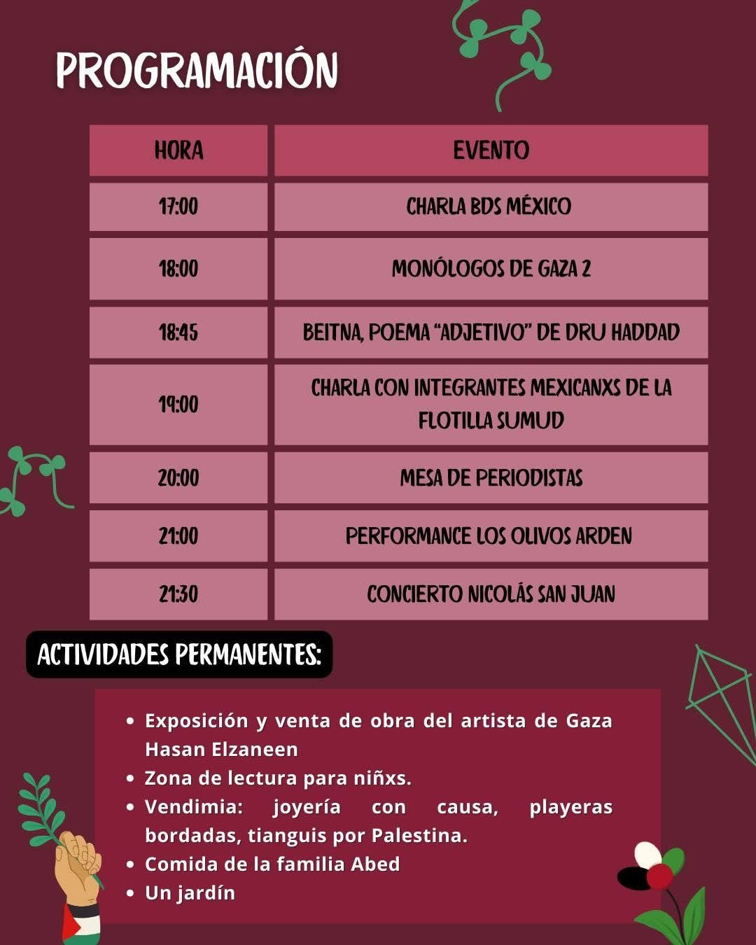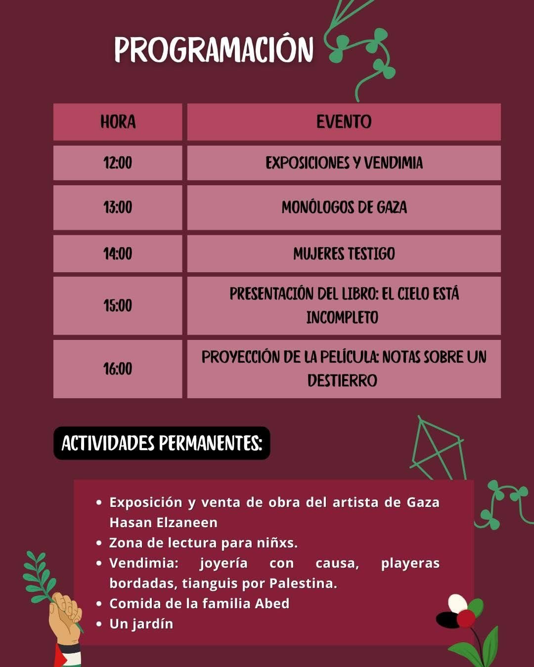 Un domingo completo de actividades: teatro, cine, música, poesía, testimonios desde Gaza, exposiciones, rincón de lectura para niñes, deliciosa comida de la familia Abed y venta de productos solidarios.