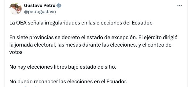 El cuestionable resultado electoral en Ecuador confirma, si acaso, un escenario preocupante que la región ya venía afrontando y que se agrava con el factor Donald Trump: tras dos “olas rosas” de victorias de partidos de izquierda democrática (la de los años 2000 y la iniciada en 2018 con el triunfo de López Obrador en México), la derecha se ha radicalizado y, en la práctica, demuestra su falta de voluntad para acatar las formas de civilidad política e incluso la ley, como lo demuestran el bolsonarismo en Brasil, Bukele en El Salvador, los golpistas derrotados en Bolivia, las oligarquías en Honduras (2009), Perú y Paraguay, y ahora el noboísmo ecuatoriano.