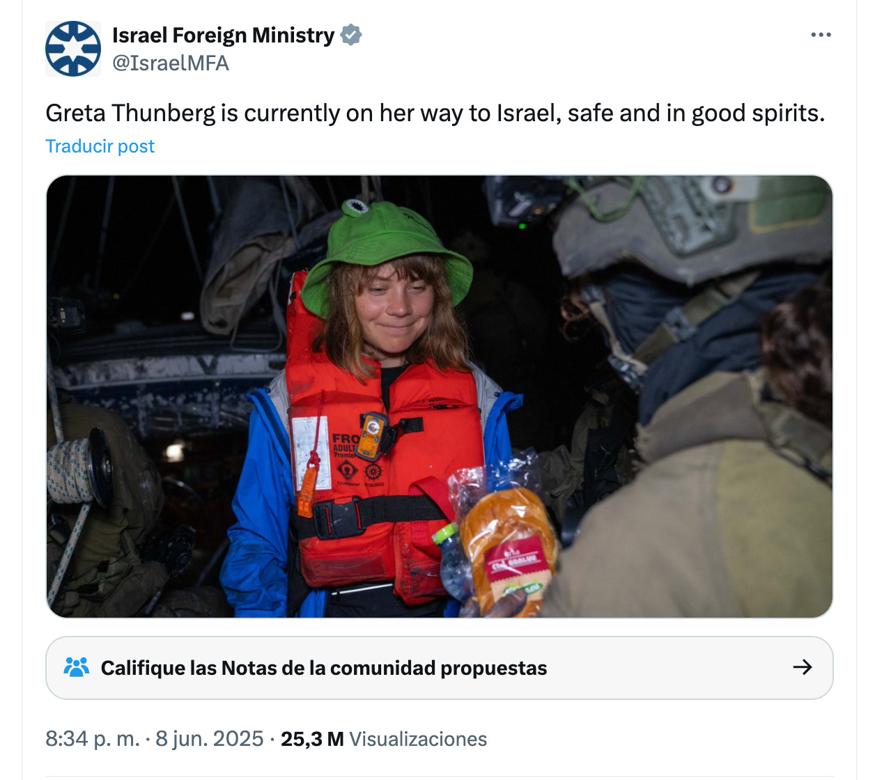 “Greta Thunberg está en camino a Israel, a salvo y de buen humor”.