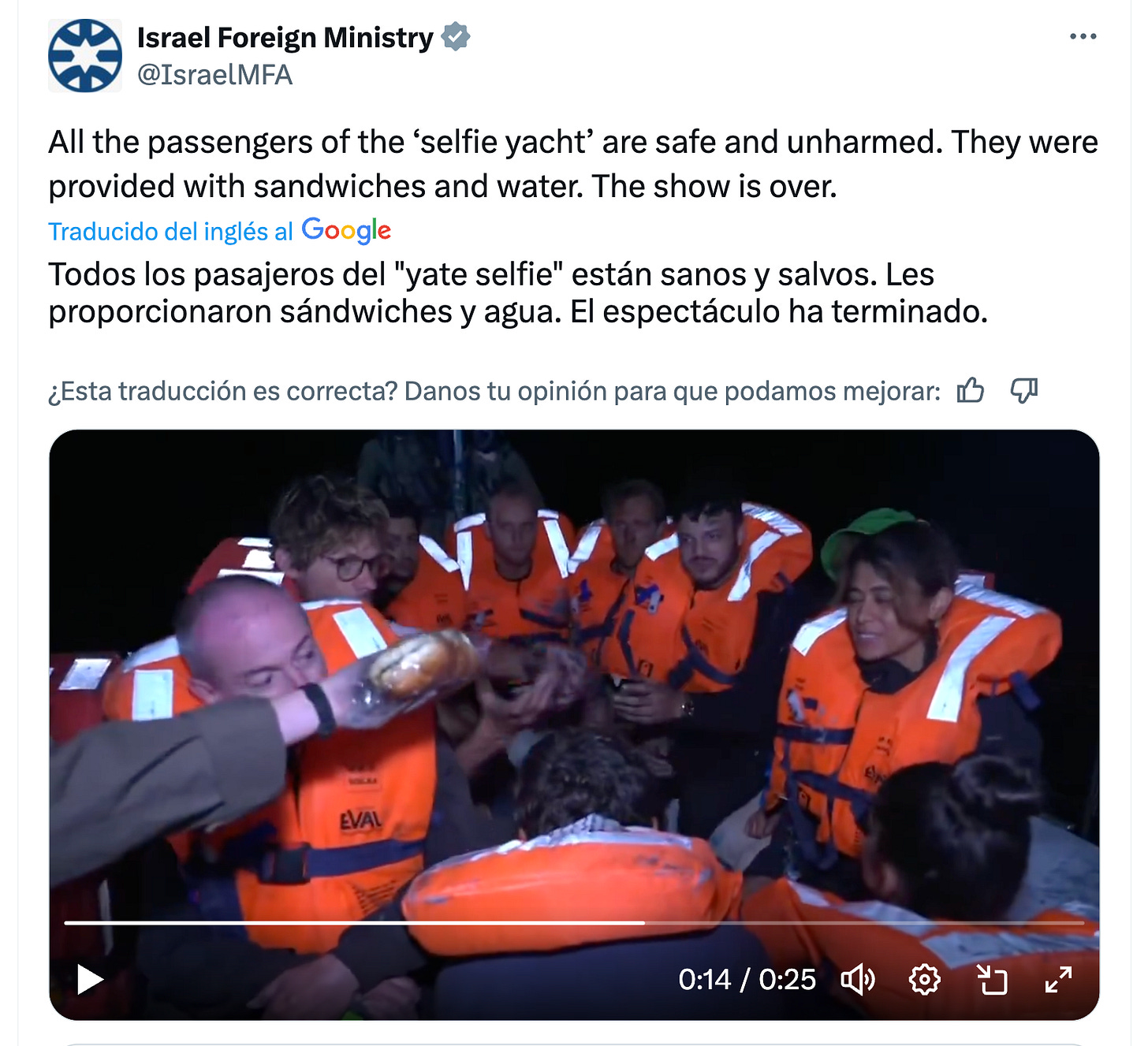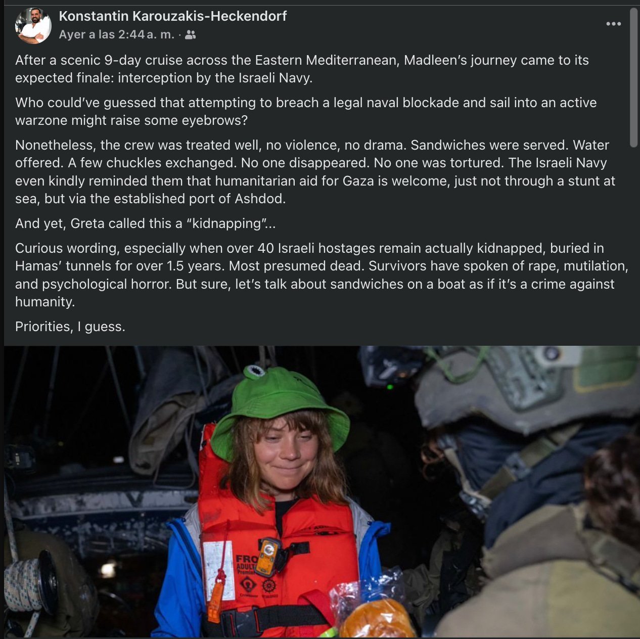 Así como sus replicadores, como este hombre que escribió que la travesía del Madleen, bajo la amenaza de barcos y drones, había sido un “crucero por el Mediterráneo” y que a los tripulantes los habían tratado súper bien (“hasta se intercambiaron unas risitas”).