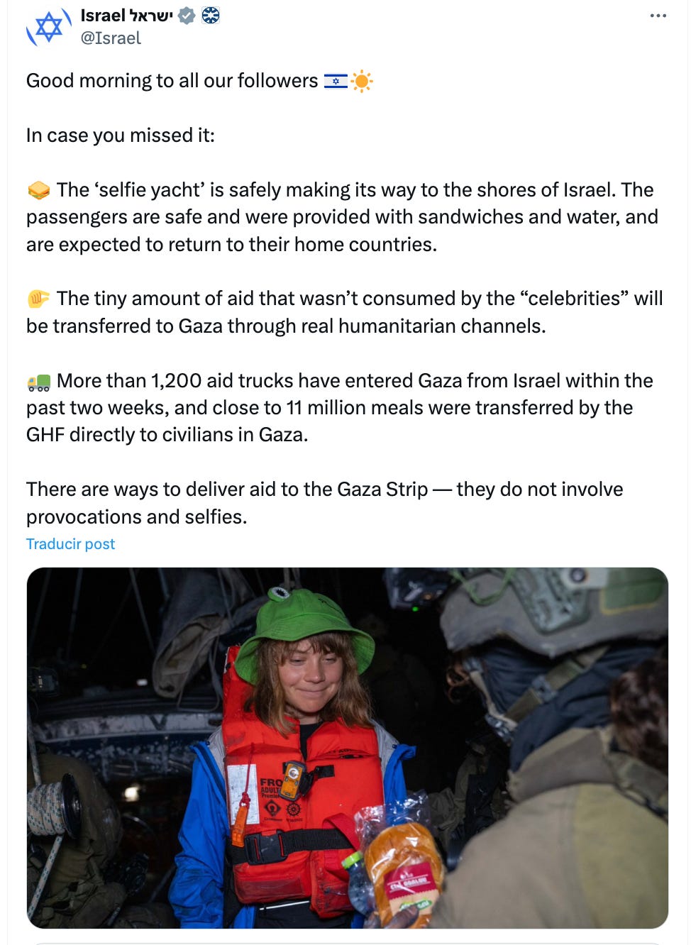 La cuenta oficial del país también le dio vuelo, asegurando que “la pequeña cantidad de ayuda que las ‘celebridades’ no consumieron, será transferida a gaza a través de canales humanitarios de verdad”.