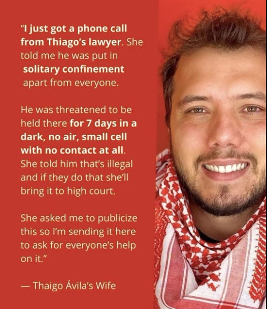 Thiago inició una huelga de hambre y sed el 9 de junio, en protesta por la intercepción ilegal del Madleen, por lo que fue trasladado a la prisión de Ayalon y colocado en régimen de aislamiento bajo condiciones descritas como "punitivas e inhumanas" por el grupo de apoyo legal palestino Adalah. El tribunal fijó una revisión de custodia para el 8 de julio de 2025, lo que podría extender su detención por un mes. No hay reportes actualizados sobre su estado físico.