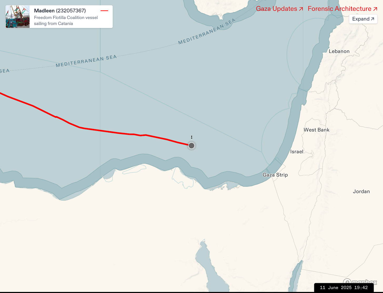 El Madleen había zarpado del puerto siciliano de Catania y llegado a un punto en aguas internacionales unos 100 kilómetros al norte de Egipto, y a 160 de Gaza. En ningún momento iba a tocar aguas territoriales israelíes.