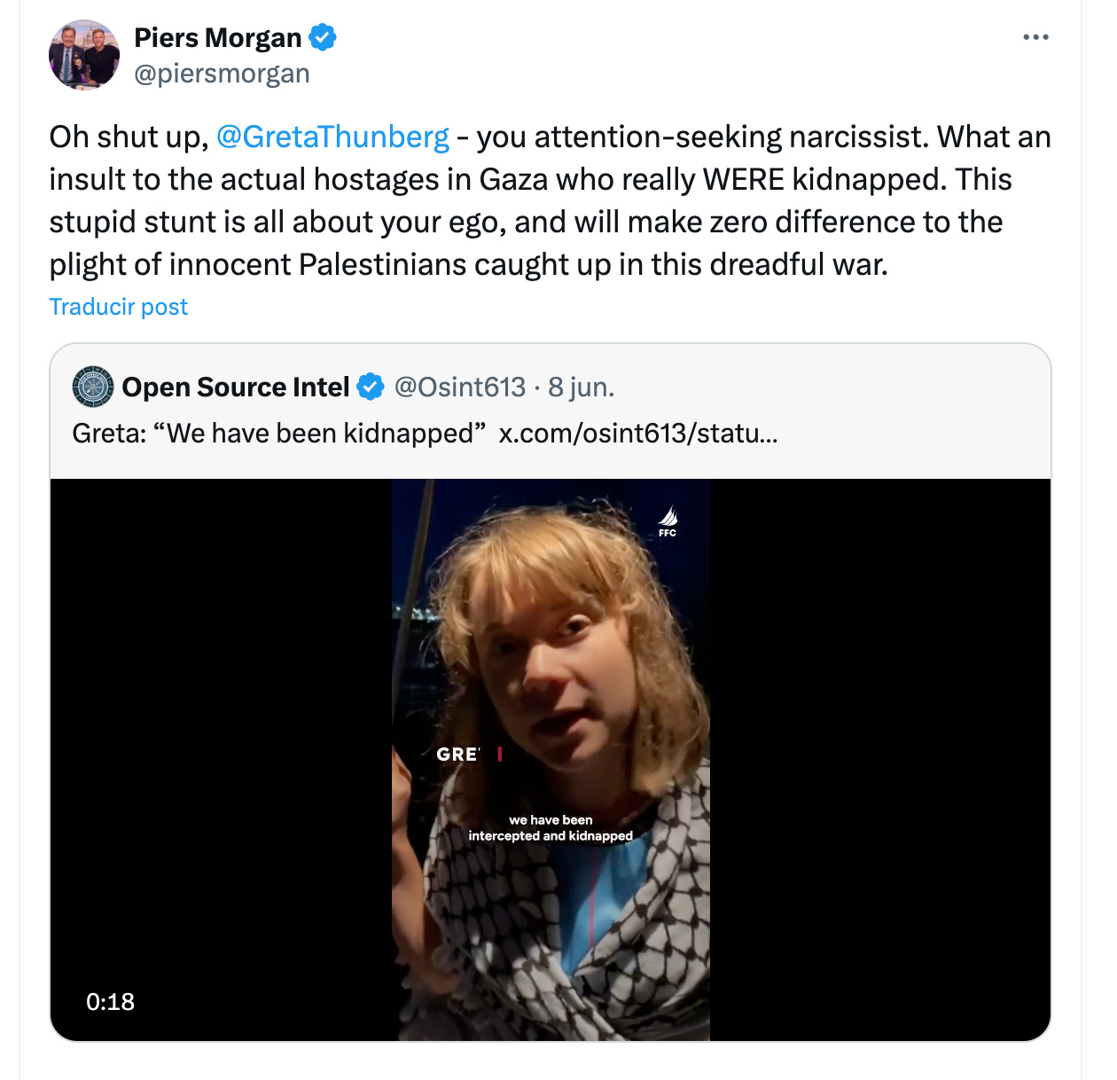 Eso dio más material para atacarla. Aquí, el popular opinador británico Piers Morgan, un señor enojado que tuitea desde su residencia en Kensington, Londres, o desde sus propiedades en Newick, East Sussex, y en Beverly Hills, California, y que realiza programas de televisión que giran alrededor de su persona, se lanza contra ella acusándola de “narcisista buscadora de atención” y asegurando que “todo este estúpido montaje se trata de tu ego”.