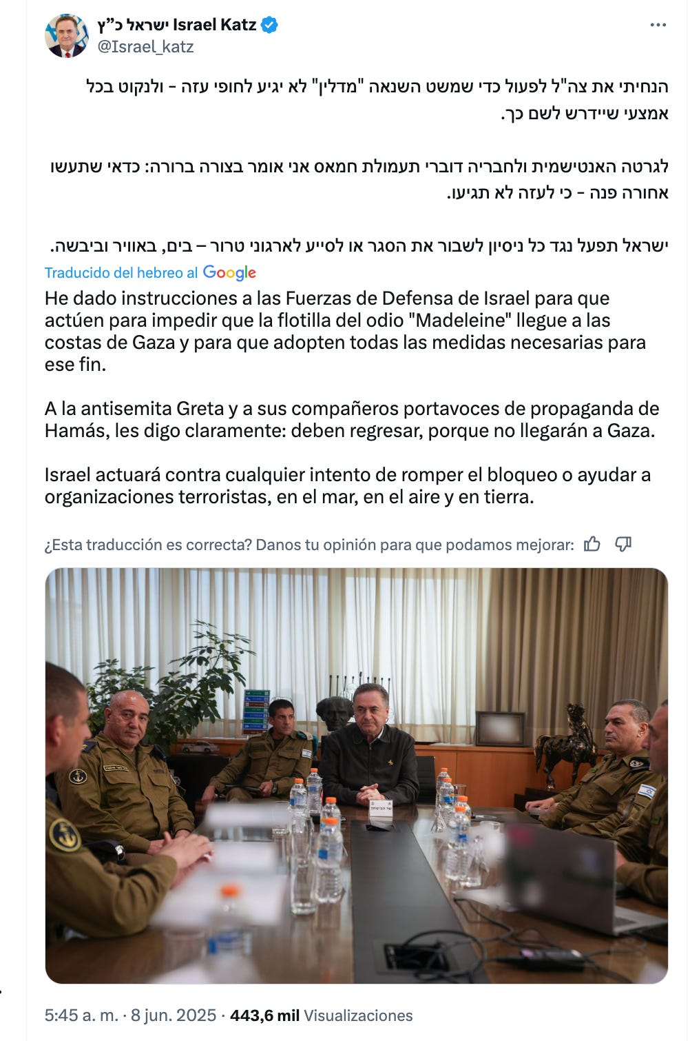 Este es un tweet del ministro de Defensa Israel Katz: