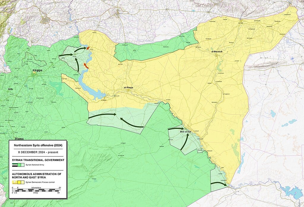 En las últimas semanas, con apoyo militar turco, el ENS logró arrebatarles a los kurdos cuatro regiones (en verde claro), especialmente el estratégico pueblo de Mambij (área verde claro de arriba a la izquierda, a 80 kilómetros al este de Alepo), y con el apoyo de la fuerza aérea turca, que solo en enero lanzó más de 30 ataques contra tropas kurdas y población civil, mantiene la presión con el objetivo de cruzar el río Éufrates -ya se apoderó de la orilla occidental- y avanzar sobre territorio kurdo.