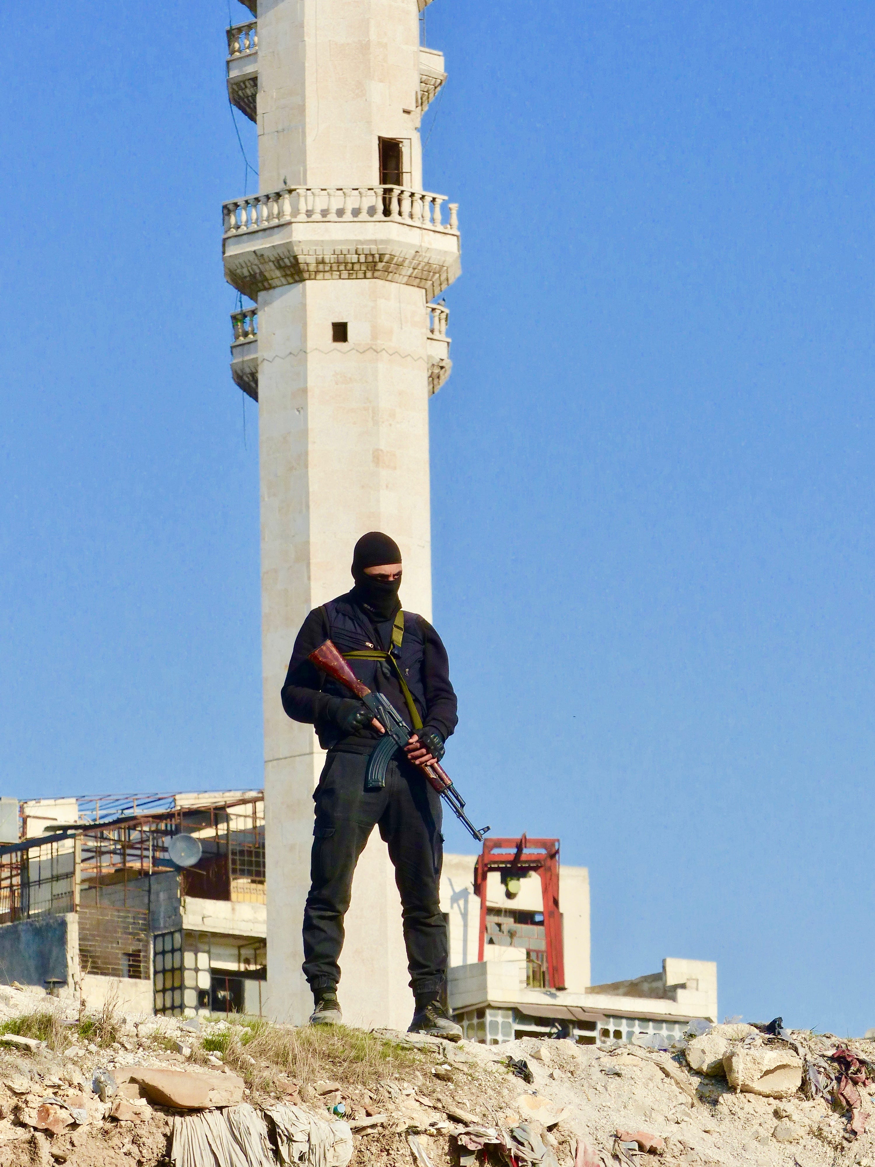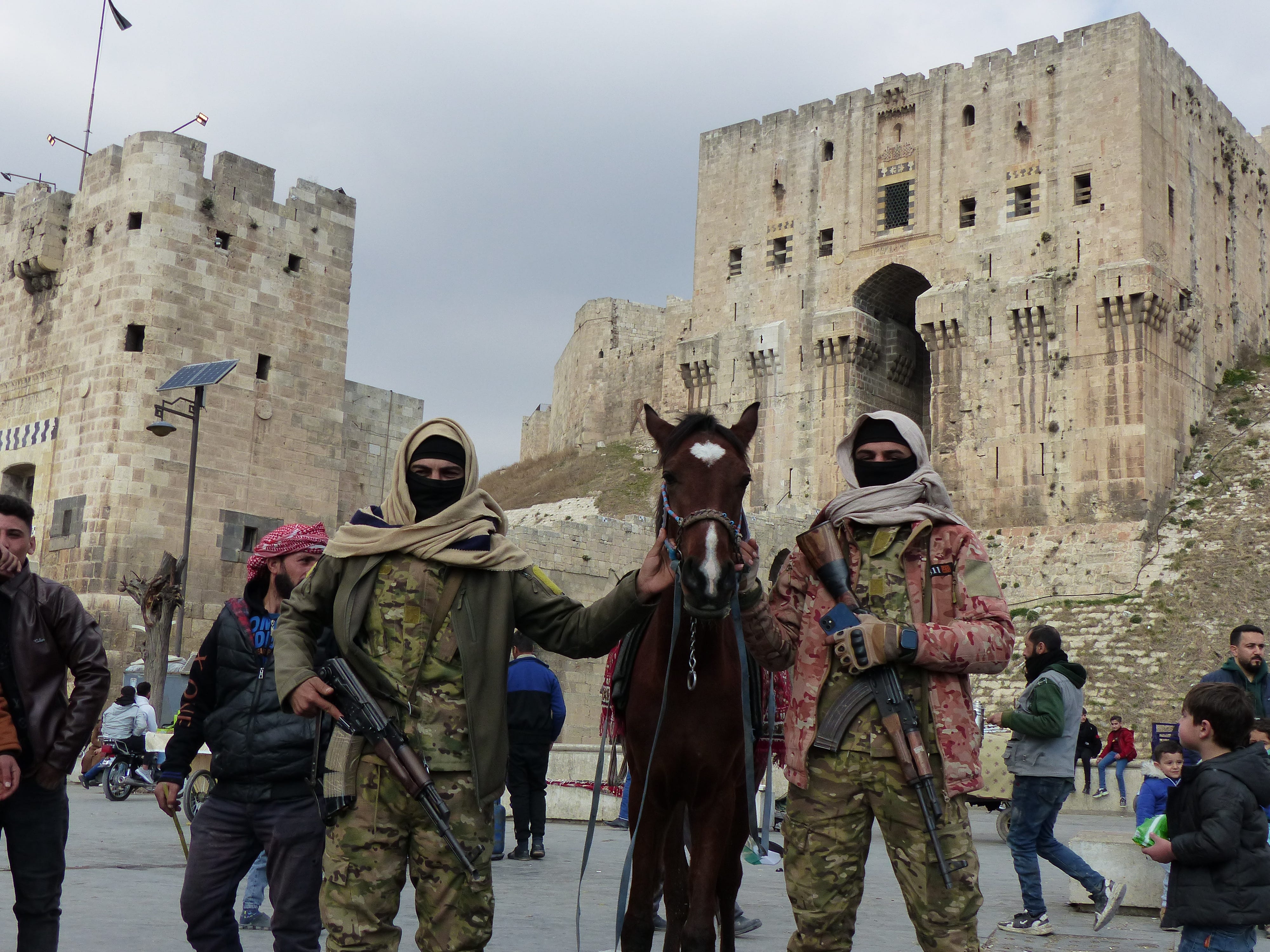 El martes 28 de enero, con los periodistas Ítalo Rondinella y Andrea Lazzaroni, encontramos la plaza principal de Alepo totalmente rodeada por dos filas de combatientes de HTS, actuando como parte del nuevo ejército sirio. Fue una sorpresa porque, salvo dos de sus miembros que vimos cuidando la milenaria Ciudadela días atrás, en esa urbe no había seguridad pública ni presencia visible de grupos armados en las calles.