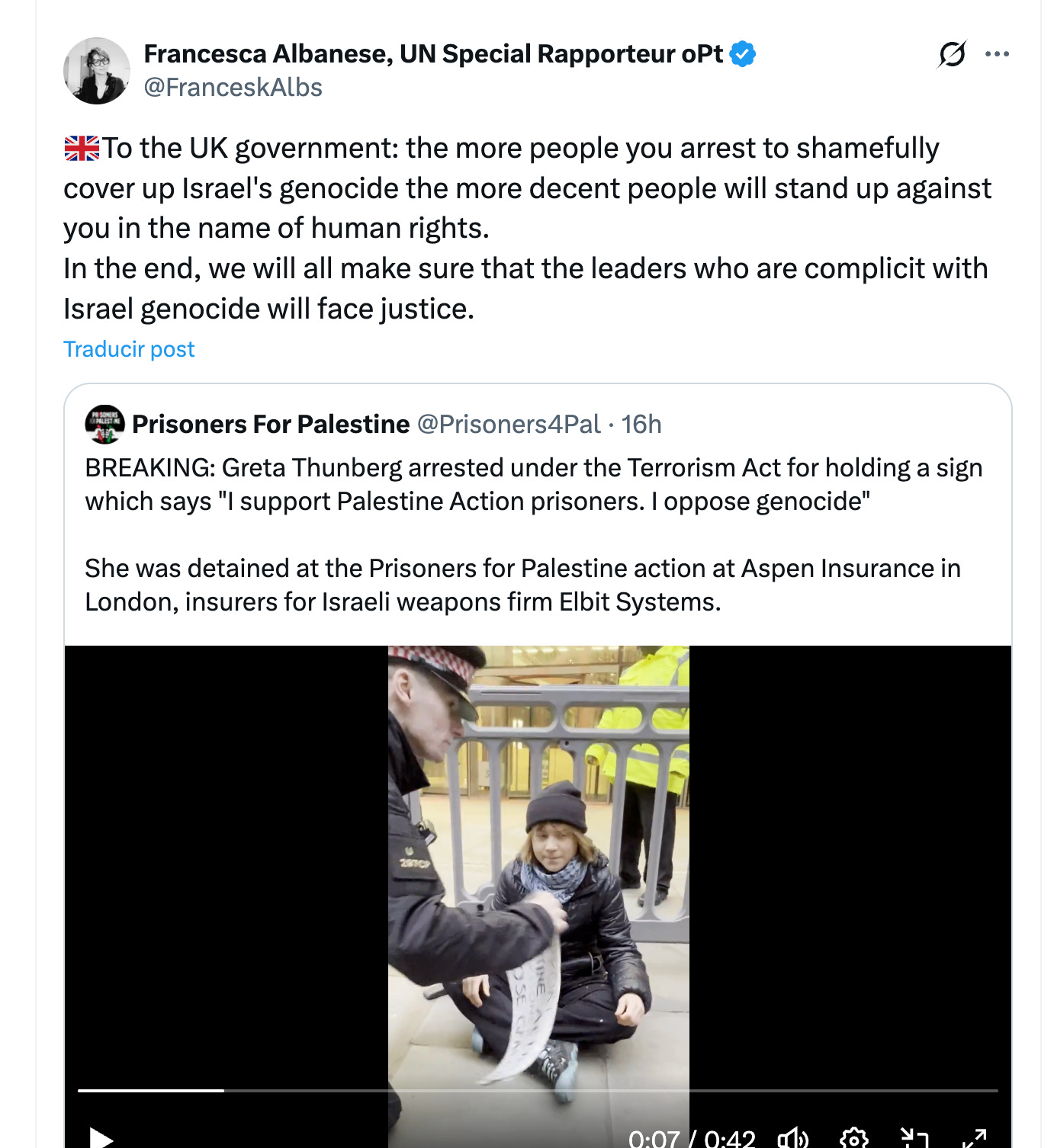 Al gobierno del Reino Unido: cuantas más personas arresten para encubrir vergonzosamente el genocidio de Israel, más personas decentes se levantarán contra ustedes en nombre de los derechos humanos.