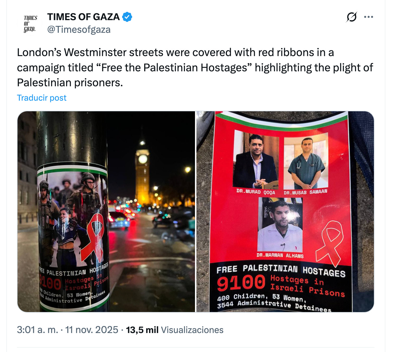 Una movimiento global llamado Campaña de los Lazos Rojos (Red Ribbons Campaign) por la liberación de los rehenes palestinos está ganando impulso. En ciudades como Londres, Ottawa y Estocolmo, activistas están atando cintas rojas en lugares públicos.