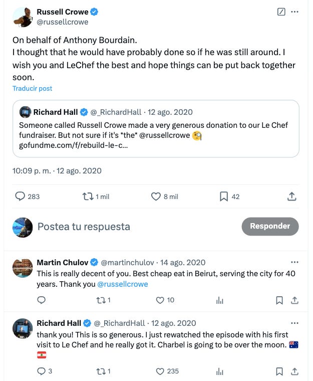 “Alguien llamado Russell Crowe hizo una generosa donación a nuestra campaña de recaudación para Le Chef. Pero no sé si es *El* @russellcrowe 🧐”, escribió en la entonces red social Twitter el periodista Richard Hall. Él y otra asidua comensal, la cineasta Amanda Bailly, convocaron al público a apoyar la reconstrucción del lugar y respondió, inesperadamente, el actor, el intérprete de un general romano en el famoso filme.