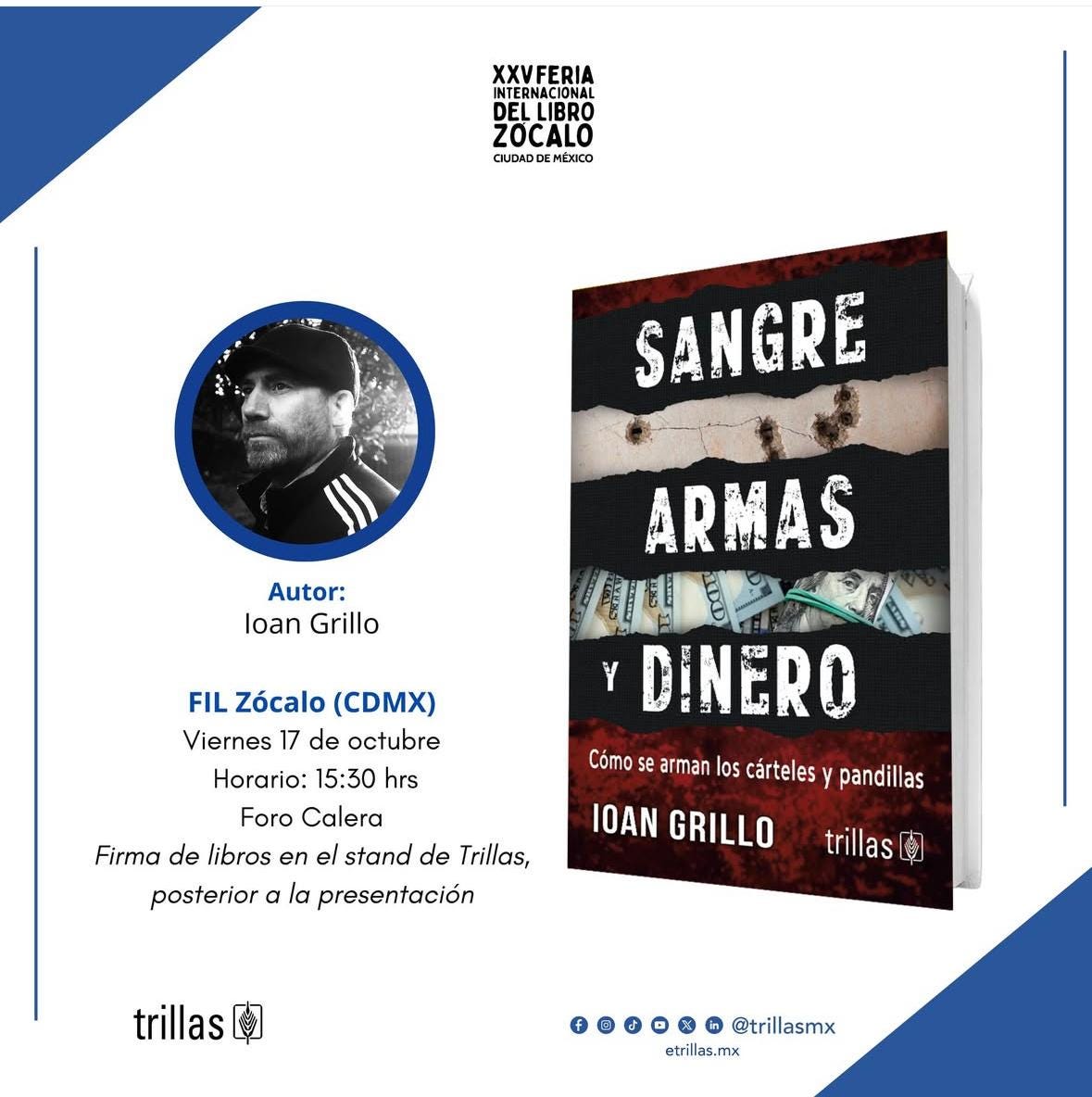 Con Marco Daniel Vázquez y el autor, tendré la oportunidad de presentar el excelente libro de Ioan Grillo “Sangre, armas y dinero”, sobre el “río de hierro” que fluye desde Estados Unidos hacia México y América Latina para alimentar la violencia criminal.
