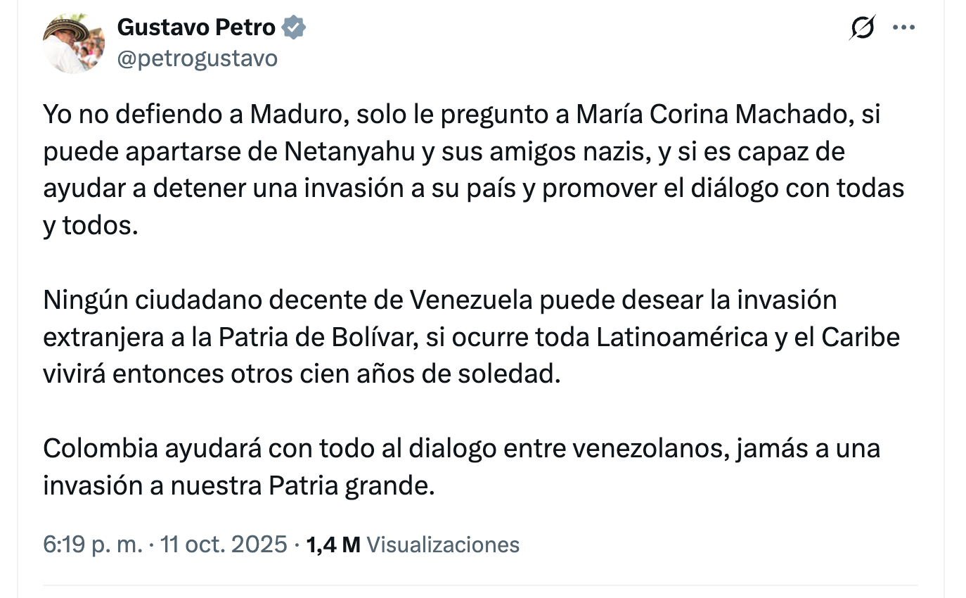Petro, como la generalidad de quienes criticaron el Nobel a Machado, recibió acusaciones de que eso equivalía a apoyar al gobierno de Nicolás Maduro. Replicó: