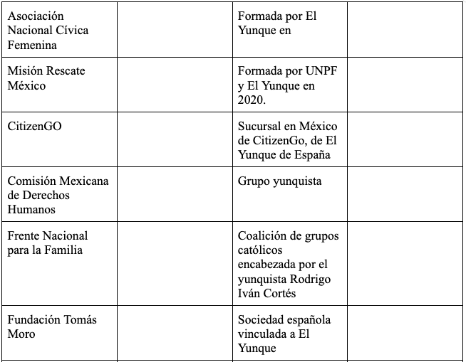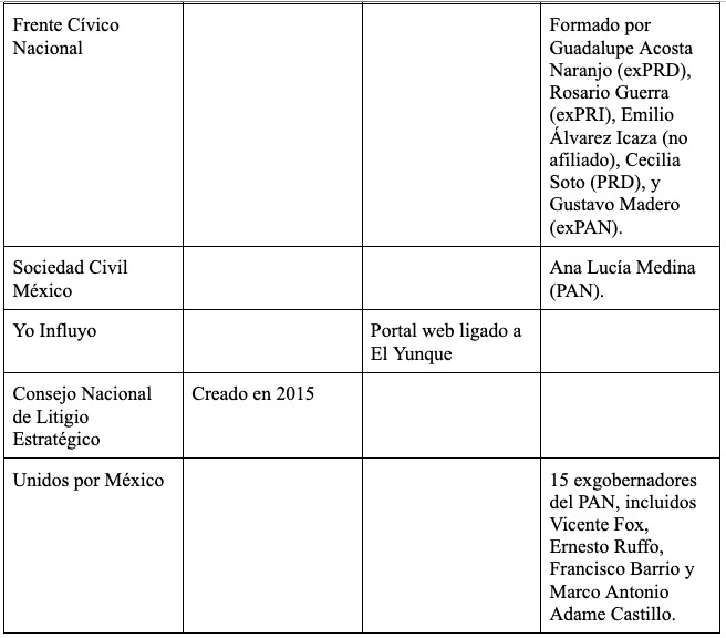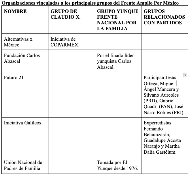 Entre las organizaciones civiles que sí tienen algún reconocimiento, en Sí Por México/Va Por México/Frente Amplio se observa una conjunción de tres sectores principales: las redes de membresías formadas por Claudio X. y Gustavo de Hoyos; las organizaciones fachada de la organización clandestina ultraderechista El Yunque, más agrupaciones religiosas articuladas a través del Frente Nacional por la Familia; y agrupaciones de individuos desprendidos de otros partidos.