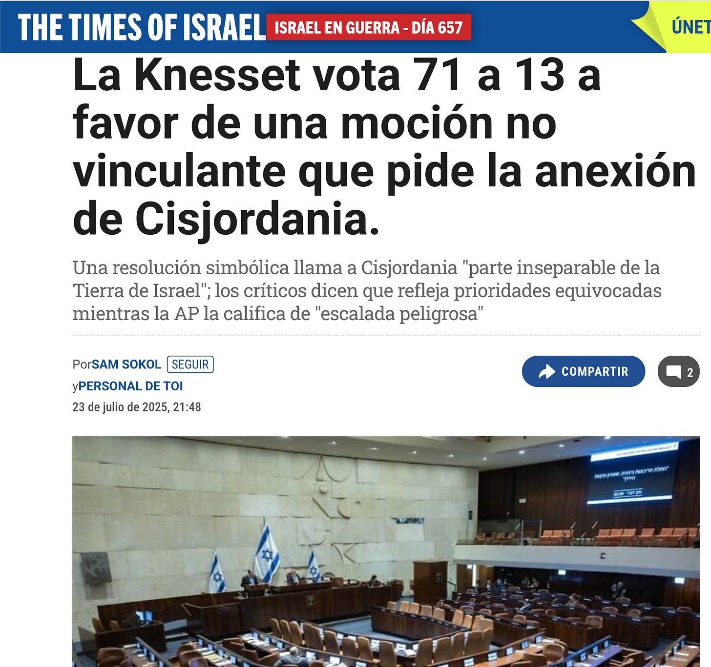 El llamado del parlamento israelí (knesset) a “aplicar la soberanía, la ley, la judicatura y la administración israelíes a todas las zonas de asentamiento judío de todo tipo en Judea, Samaria y el Valle del Jordán” no significa la anexión inmediata de Cisjordania, porque fue aprobado como resolución no de cumplimiento obligatorio, pero sí constituye un paso para legitimar un próximo movimiento del gobierno de absorción del territorio.