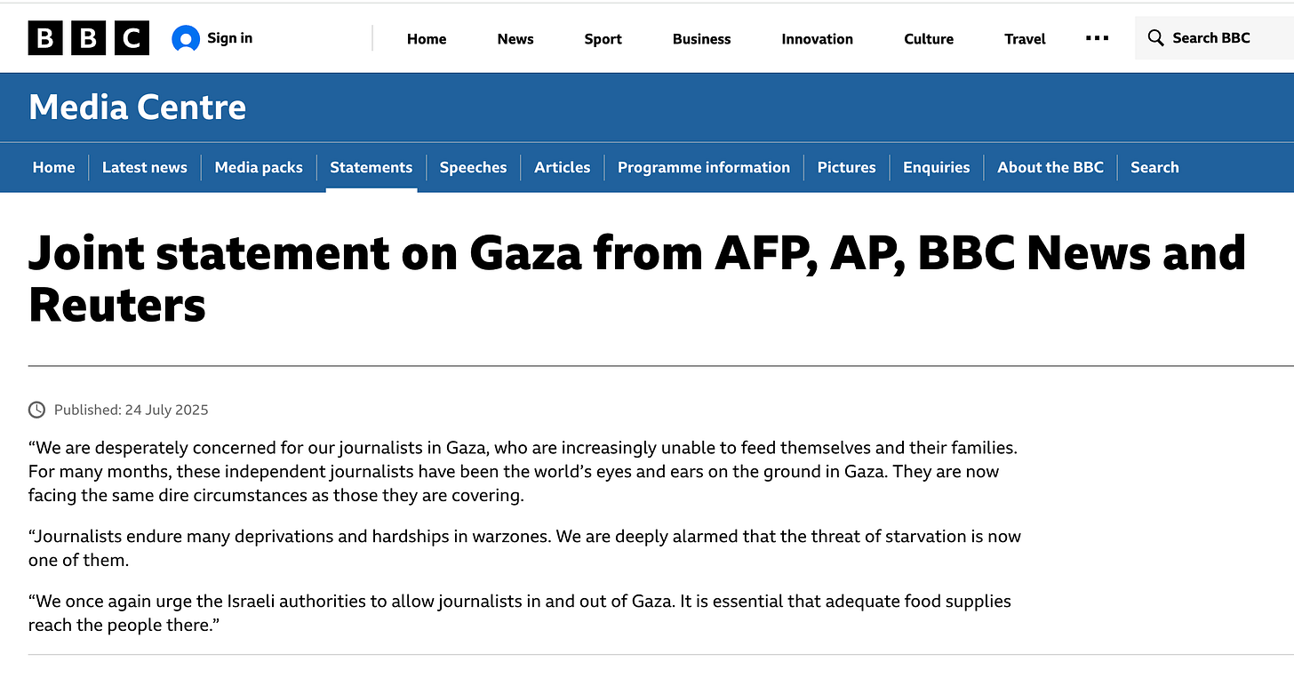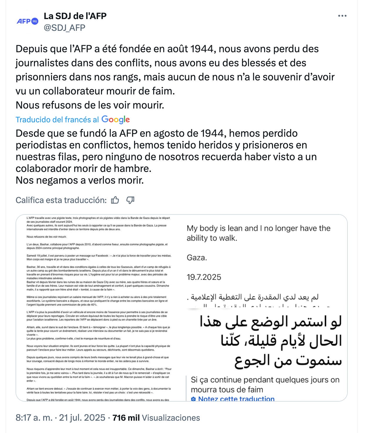 Hoy jueves, a primera hora, las grandes agencias occidentales se sumaron a los sindicalistas de AFP: las directivas de AFP, AP, BBC News y Reuters se declararon “profundamente preocupadas por nuestros periodistas en Gaza, quienes cada vez tienen menos recursos para alimentarse a sí mismos y a sus familias” e instaron “a las autoridades israelíes a que permitan la entrada y salida de periodistas en Gaza”.