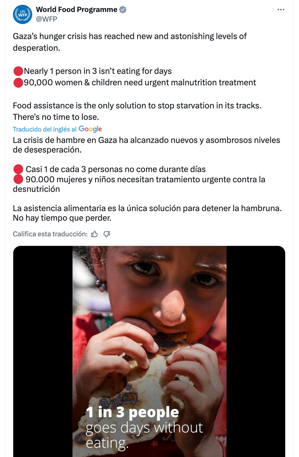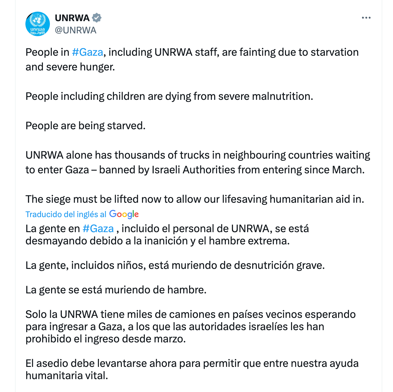 Y el personal de UNRWA, la agencia de la ONU que atiende a los refugiados palestinos, que también ha sufrido directamente la campaña de exterminio de Israel (ha asesinado a 330 de sus empleados) y ahora, indica este tweet, se está desmayando debido a la inanición y el hambre extrema.