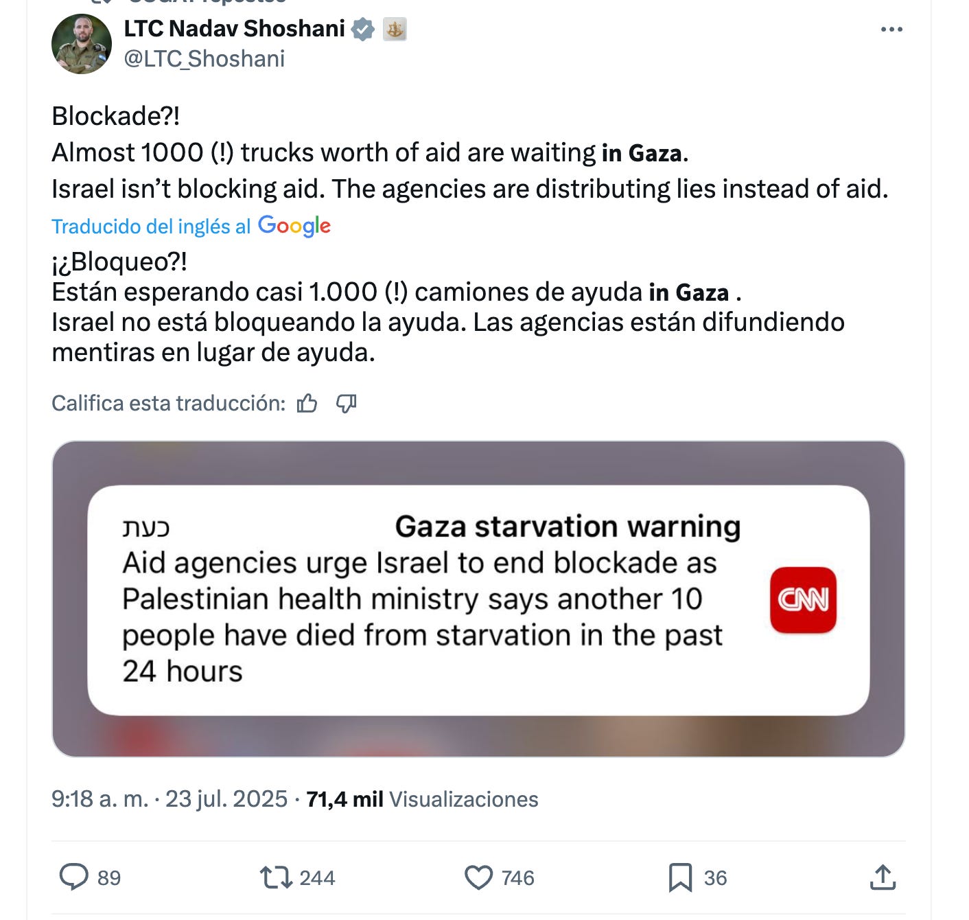 Esto continúa, como se puede ver en este tweet del vocero del Ejército, publicado el miércoles: durante 19 meses estuvieron anunciando el bloqueo de Gaza pero ahora simulan sorprenderse y se dicen calumniados por las mentiras de las agencias.