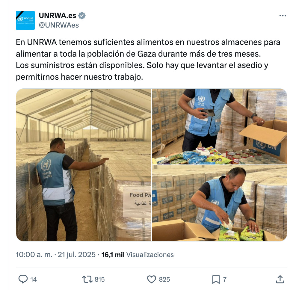 También, 111 organizaciones humanitarias ―como Médicos Sin Fronteras, Save the Children, Cáritas y Oxfam―, denunciaron la responsabilidad principal de Israel en la hambruna, dijeron que los almacenes con toneladas de suministros permanecían intactos justo en las afueras del territorio, e incluso dentro, ya que se les impide entregar los productos.