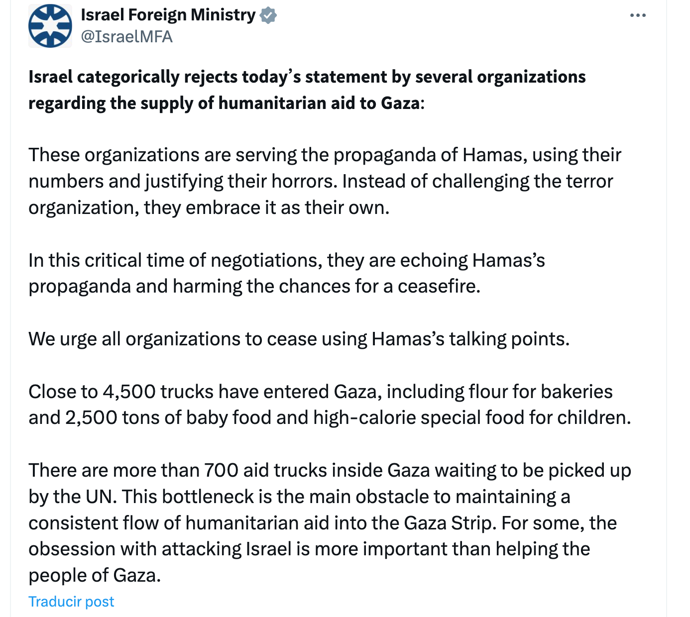 Israel asegura no tener responsabilidad por la hambruna. Antes, negaba que existiera, descalificando las denuncias como propaganda de Hamás. Las imágenes de niños y adultos muriendo de desnutrición parece haber forzado un cambio de estrategia mediática: ahora, Israel admite que hay hambre pero se lava las manos y acusa a otros: se trata de “una escasez provocada por el hombre y diseñada por Hamás”; y a la ONU y otras organizaciones que por años los han entregado a la gente, pero que, asegura el ejército, simplemente no los recoge aunque están disponibles ya dentro de Gaza.