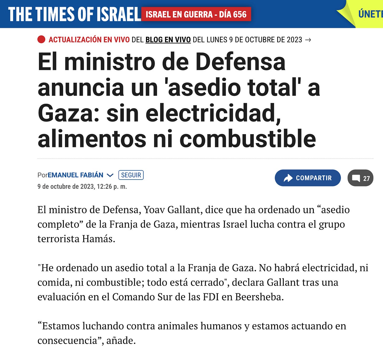 El 9 de octubre de 2023, el entonces ministro de Defensa de Israel, Yoav Gallant, lo anunció en los términos más crudos: “He ordenado un asedio total a la Franja de Gaza. No habrá electricidad, ni comida, ni combustible; todo está cerrado”. En una expresión que quedará para la historia del racismo, y anticipando el genocidio, añadió: “Estamos luchando contra animales humanos y estamos actuando en consecuencia”.