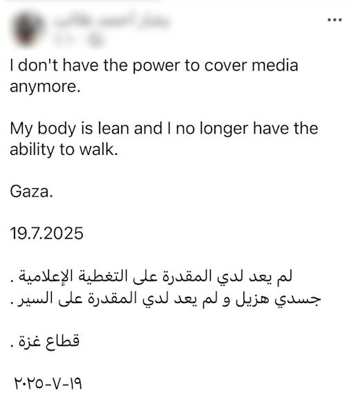 “Me muevo despacio, a diferencia de antes. El peligro no son solo los bombardeos. El hambre nos está matando poco a poco y amenazando nuestra capacidad de seguir adelante. Ahora, no solo estoy informando. Estoy viviendo la catástrofe y documentándola al mismo tiempo”.
