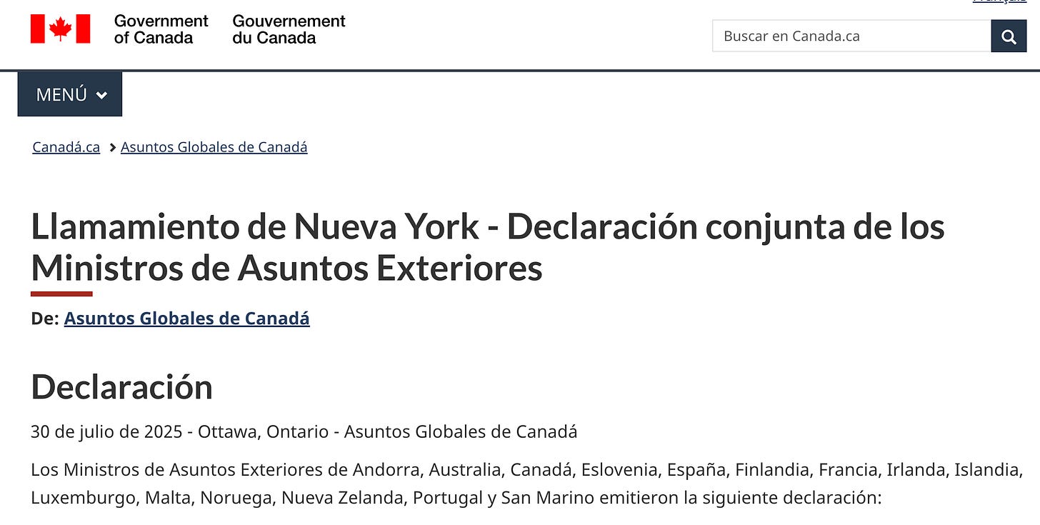 A pesar de que Canadá está padeciendo la presión y las groserías de Trump en su guerra comercial, este miércoles 30 se adhirió a la advertencia de reconocer el Estado de Palestina en septiembre, anunciándolo en un comunicado que adelanta que más países, como Australia y Nueva Zelanda, pueden seguir esa misma ruta, ya recorrida por España, Irlanda, Eslovenia y otros.