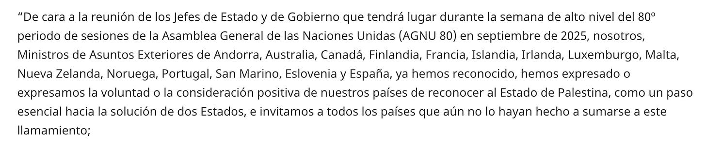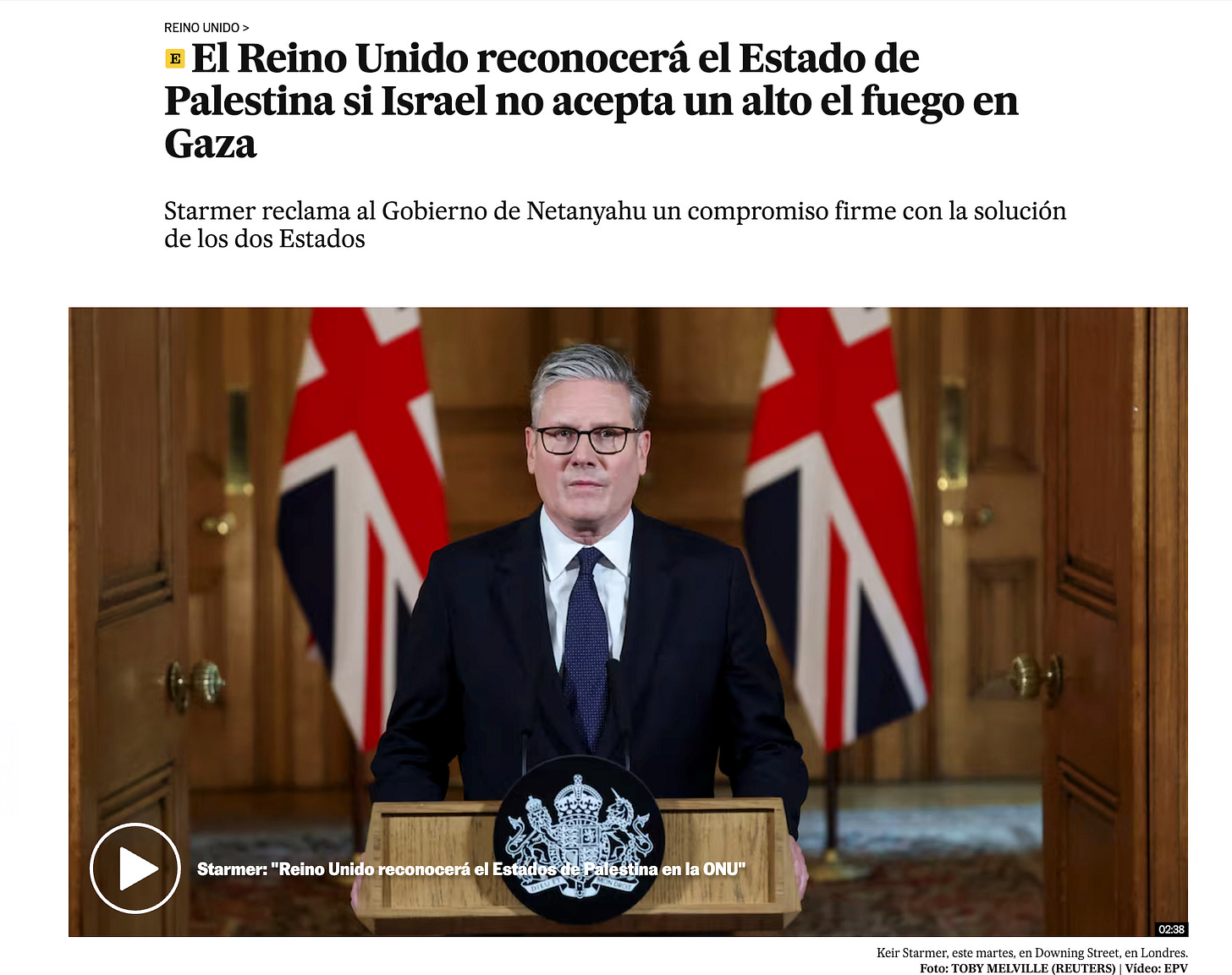 El Reino Unido reconocerá el Estado de Palestina en septiembre ante la Asamblea General de Naciones Unidas, a no ser que el Gobierno de Israel emprenda pasos relevantes para poner fin a la escandalosa situación en Gaza, alcance un alto el fuego, deje claro que no se anexionará Cisjordania y se comprometa a un proceso a largo plazo que concluya con una solución de dos Estados.