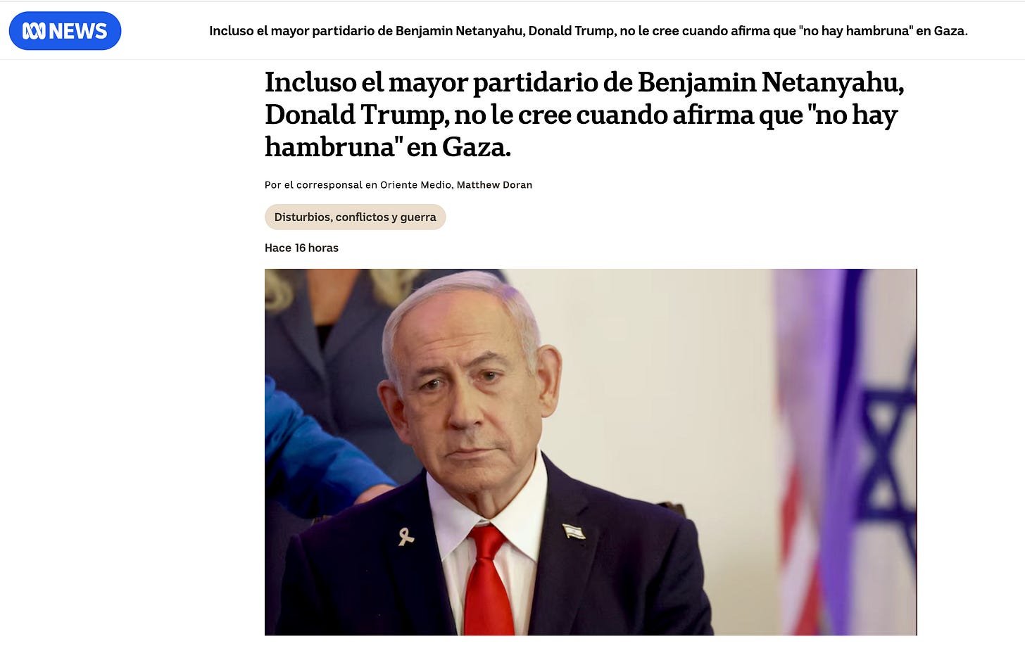 Eso no significa que Trump esté dispuesto a modificar su política de apoyo total al gobierno de Netanyahu. Pero sí son señales de que la narrativa israelí es intragable hasta para sus mayores partidarios, como señala la cadena australiana ABC en este titular: