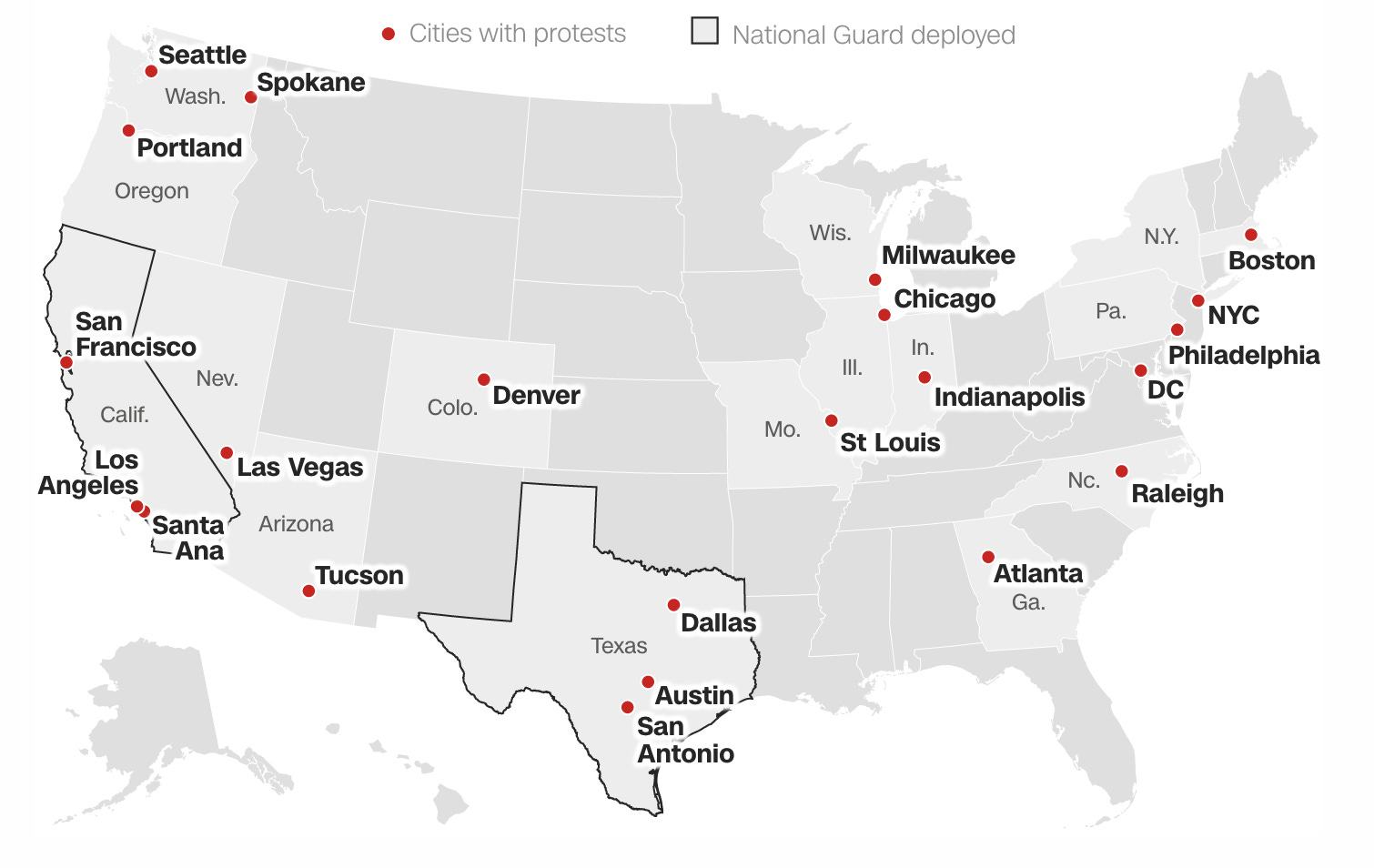 Esto encendió más protestas, que ya se extienden por otros 15 estados y D.C. (esta gráfica de CNN marca con rojo las ciudades donde se han registrado manifestaciones contra Trump y ICE, al 12 de junio), se realizan cada día y este sábado conectarán con las del No Kings Day.
