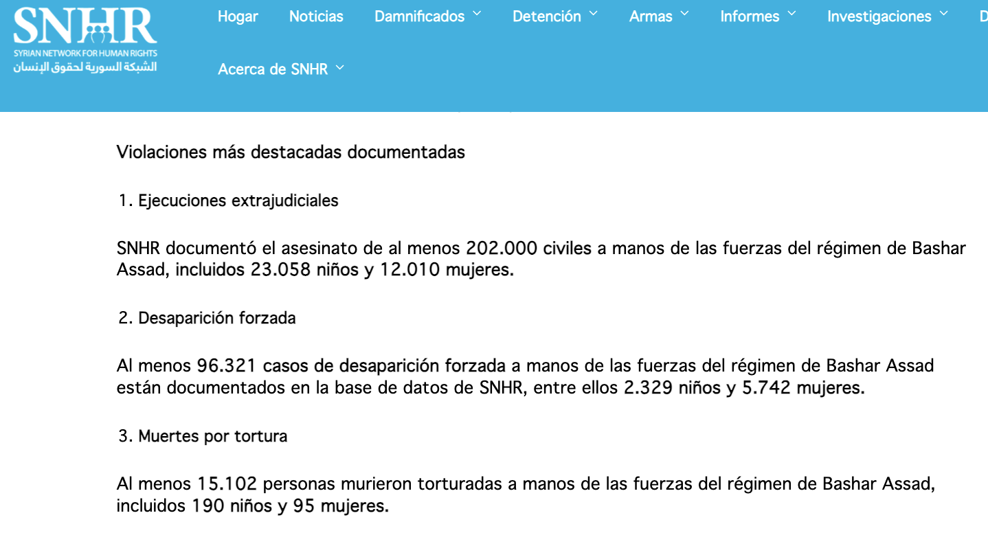 A lo largo de la guerra, la Red Siria de Derechos Humanos documentó crímenes cometidos por todas las partes en conflicto. El 20 de diciembre de 2024, presentó un resumen de los que corresponden al régimen de al Assad: