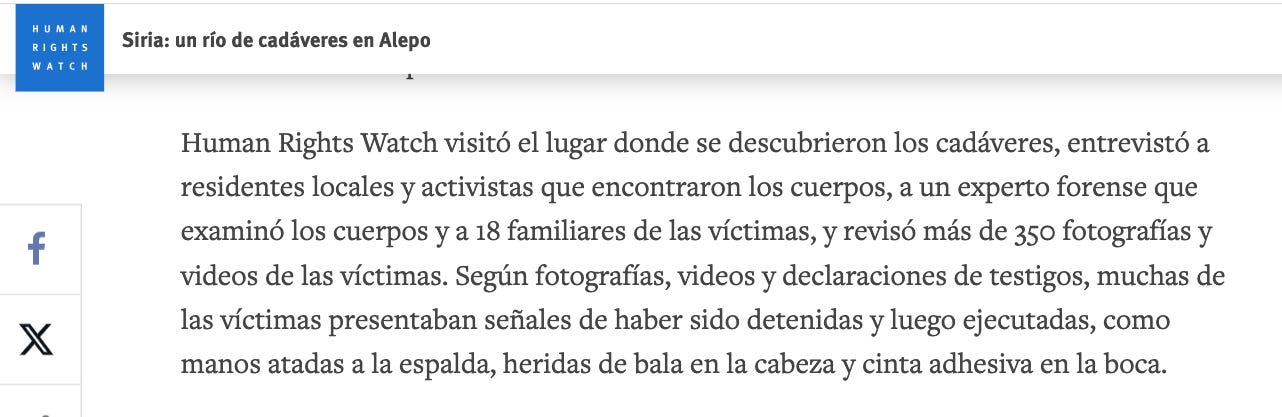 En el caso de la guerra en Siria, el campo derrotado (el de al Assad con quienes lo sostenían: Rusia, Irán y Hezbollah) ha estado retomando las preocupaciones reales que hay sobre los nuevos gobernantes, que hasta 2016 eran parte de Al Qaeda pero se separaron de ella y acabaron combatiéndola a balazos, y los crímenes y excesos que sin duda se cometen tras su victoria, para exagerar las cosas y presentar el nuevo régimen como uno controlado por Estado Islámico, que persigue a las mujeres y comete enormes masacres, cuando antes -según esta versión - había orden y libertades.