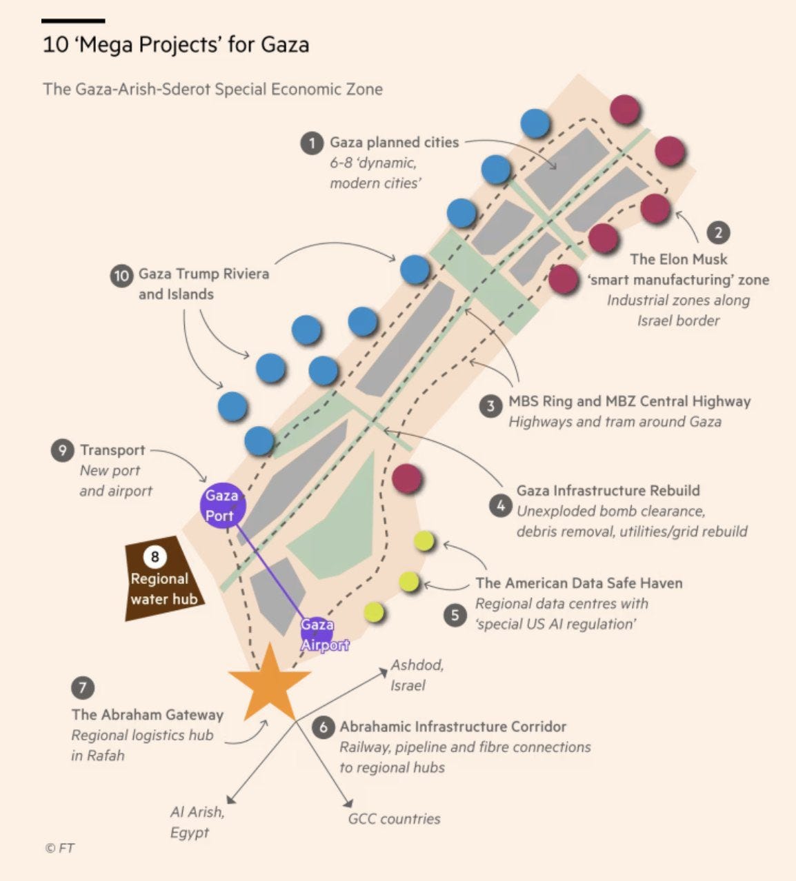 Al estilo de Trump, que ama los títulos grandiosos, este plan se llama “The GREAT Trust” o El GRAN Fideicomiso” (GREAT es el forzado acrónimo en inglés de Reconstitución, Aceleración Económica y Transformación de Gaza). El eje es convertir estas tierras palestinas en una zona “tipo Dubái”: una franja costera reurbanizada con hoteles y resorts, “smart cities”, polos manufactureros y un hub logístico-energético con puertos, autopistas y desalinizadoras. Para poder hacerlo, el territorio quedaría bajo la autoridad de este fideicomiso, que será encabezado por Estados Unidos durante al menos una década, concediendo a Israel solo las prerrogativas de seguridad. Lo de “solo” es desde el punto de vista de los israelíes, que quisieran mucho más.