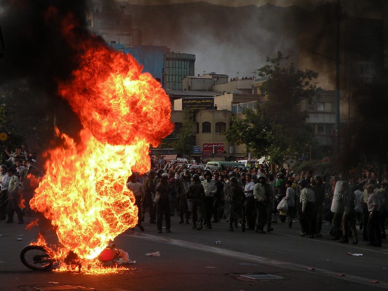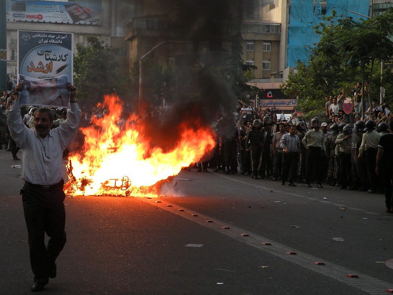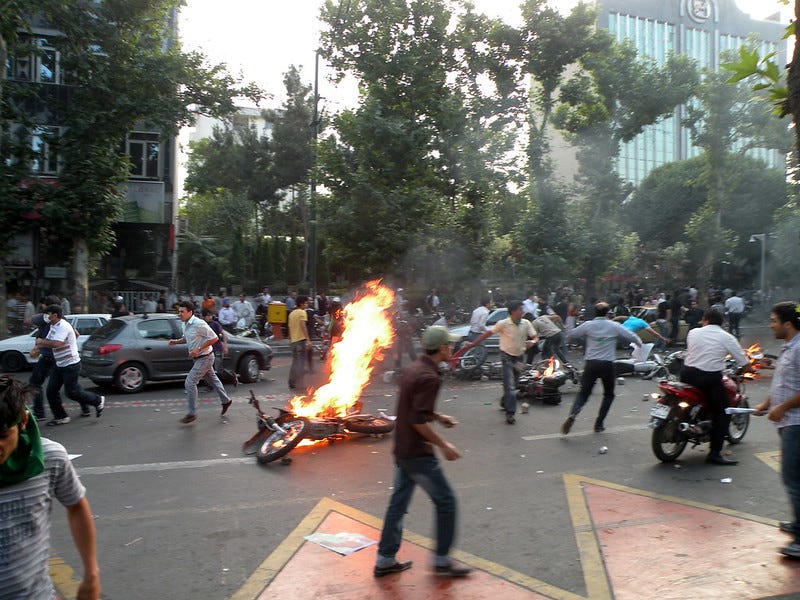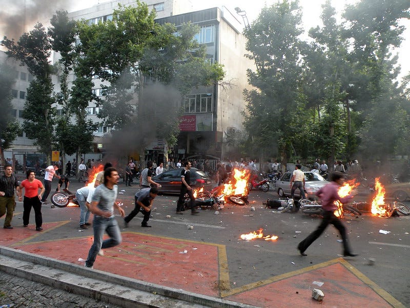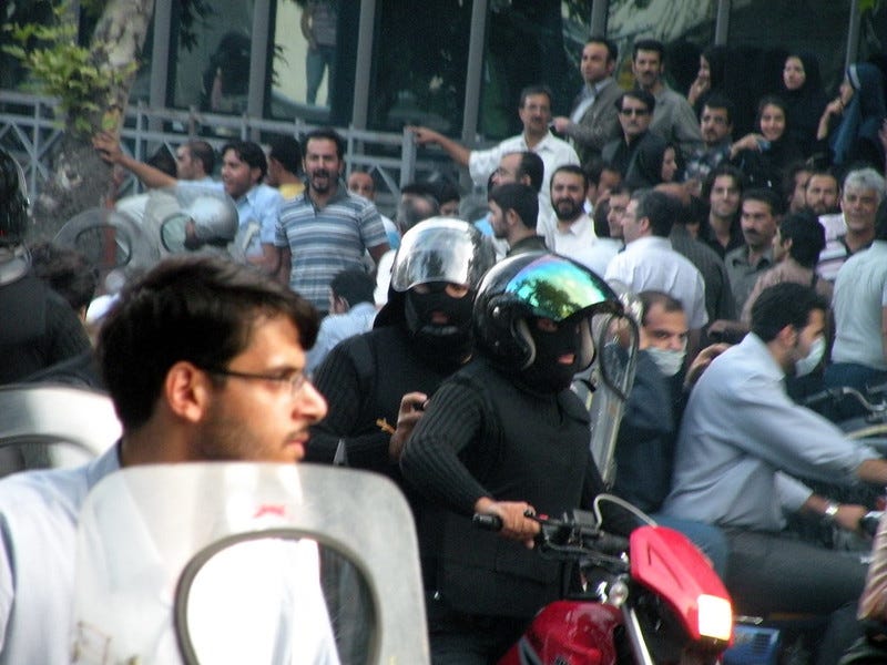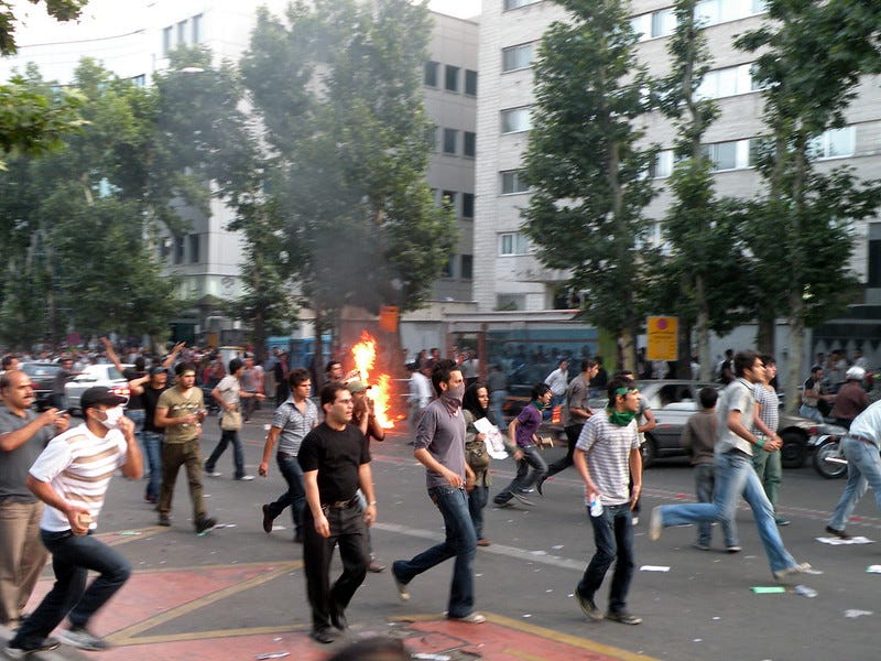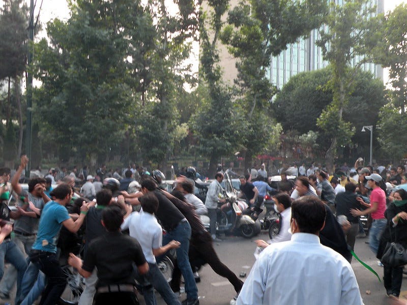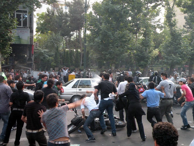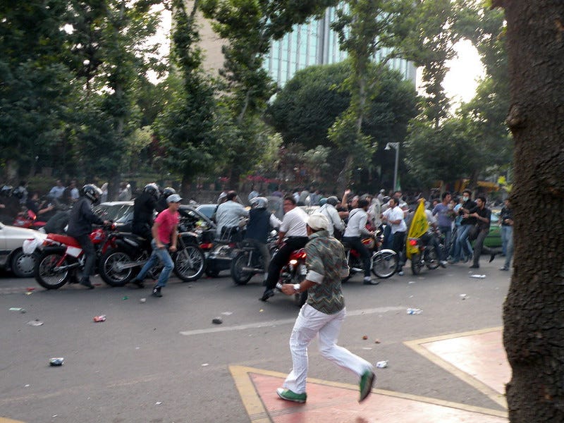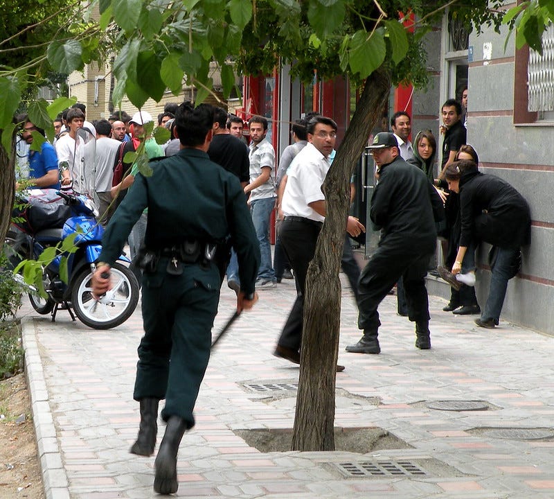 Pero ya no les servía de nada porque los habían expulsado del país. Los iraníes tampoco se tragaron el cuento, desde el día siguiente empezaron a protestar, el régimen lanzó a la policía y los temibles milicianos basijis en su contra, el ejército de los Guardianes de la Revolución amenazó con intervenir, empezó a haber muertos y heridos, y el gobierno decidió que a final de cuentas ya no quería presumirles nada a los medios extranjeros. Todos los que habían recibido visado de prensa estaban bajo su control: cada uno tenía a un funcionario dedicado a “facilitarle” el trabajo, lo que era un eufemismo para vigilar sus movimientos y contactos, y que se encargó de hacerle saber que era hora de marcharse, que muchas gracias, adiós. El lujoso Laleh International Hotel fue tomado por la policía secreta. Los camarógrafos regresaban con las imágenes de los enfrentamientos, duramente obtenidas, sólo para ser interceptados justo al entrar al edificio y despojados de su material.