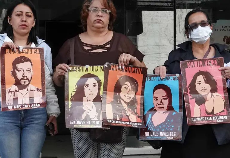 Estaban presentes algunas jóvenes integrantes de la comunidad colombiana. También del sindicato de trabajadoras domésticas. Los compañeros de Rubén y Nadia arribaron de Xalapa, apenas con ánimo para protestar. Si en la capital sentíamos la muerte rondando, allá les había puesto la pata sobre el cuello. Congoja, dolor, miedo. E impotencia. Noé Zavaleta lloraba sobre las escalinatas de mármol del monumento. La moral se le escurría entre las manos: “Ya no sé si vale la pena pedir justicia o no, al final de cuentas yo no voy a volver a ver a Rubén. ¿Para qué? ¿Qué tipo de justicia te van a entregar cuando vemos que lo quieren hacer pasar como un saqueo, robo o un simple delito del fuero común? Para serte sincero, no sé si valga la pena pedir justicia o no en un México impune”.