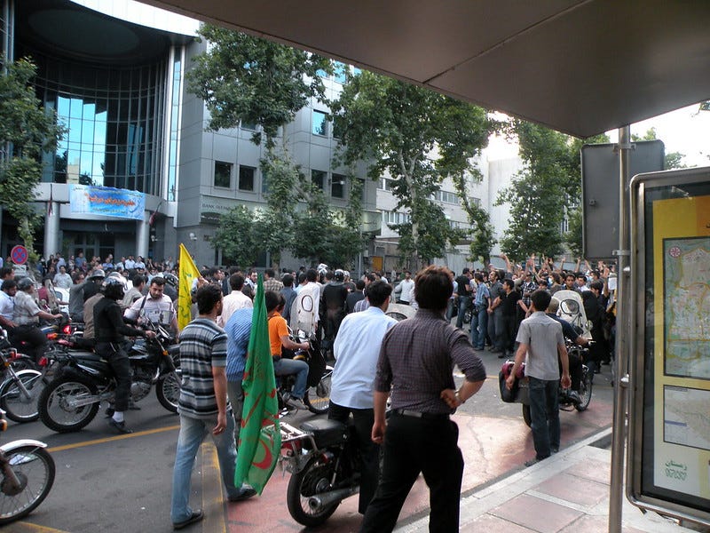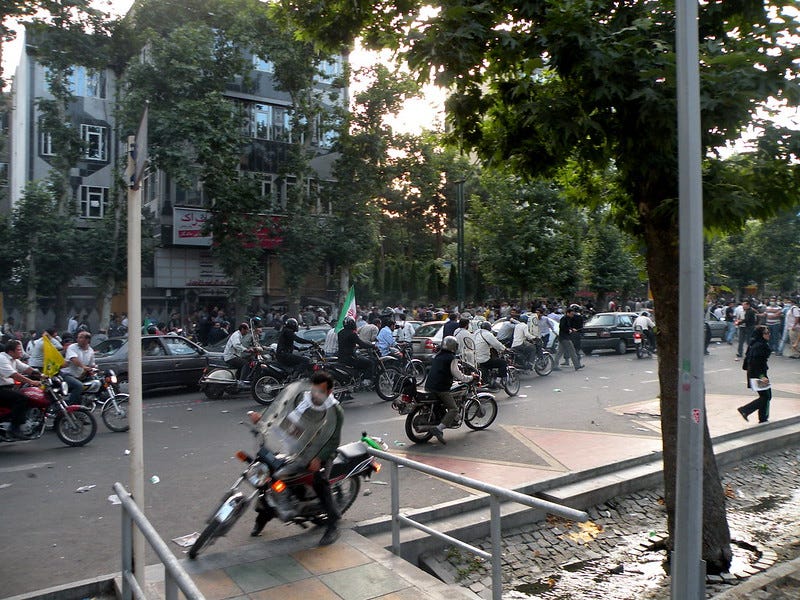 Pero unos pocos volábamos por debajo del radar: habíamos entrado como turistas y nos alojábamos lejos de ahí, en un sitio barato por el Gran Bazar de Teherán. El truco era pasar desapercibidos. Dos holandeses –altos, rubios- fueron detectados de inmediato y apaleados por antimotines, y esa misma noche estaban en un vuelo a Europa. Sólo los que pudimos utilizar nuestro aspecto físico y discreción para pasar desapercibidos, logramos permanecer más tiempo y cubrir las manifestaciones, en las que un pueblo valiente (conducido por mujeres, por cierto: el marcado carácter independiente de las persas ha resistido por más de un milenio a la presión religiosa, y la República Islámica ha sido incapaz de someterlo) confrontó en las calles la violencia de este régimen, a un alto costo en vidas.