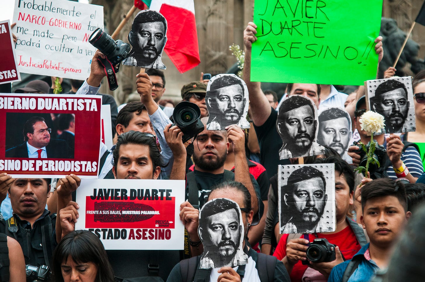 Todos somos Rubén. A los pies de la columna de 52 metros, que sostiene una Victoria Alada, decenas de fotógrafos se colocaban sobre el rostro fotografías de Rubén Espinosa, en blanco y negro, y mostraban sus cámaras. Éramos unas 400 personas. Algunos carteles rezaban: “Gobierno duartista / asesino de periodistas”; y el eslogan “No se mata la verdad matando periodistas”. La luchadora social Julia Klug mostraba una bandera de México en la que el símbolo central, un águila que devora una serpiente, estaba enmarcado por palabras escritas en negro: “Periodista honesto / periodista muerto”.