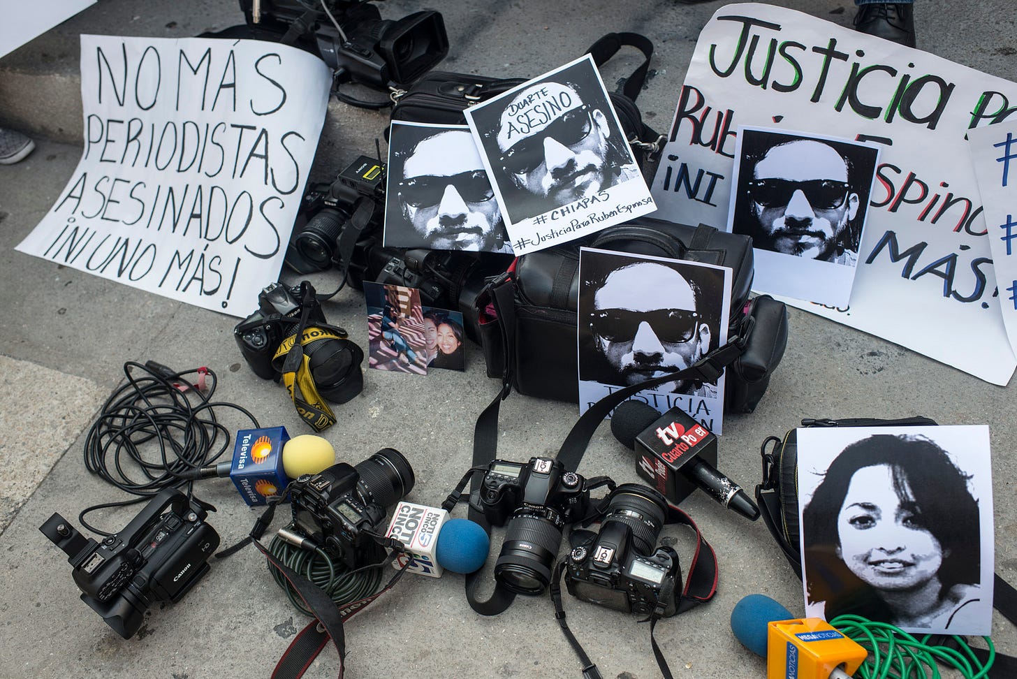 Con cámaras y lentes, fotos de las víctimas e imágenes captadas por Rubén, y claveles blancos, formaron un pequeño altar sobre un grueso papel ocre. “¡Justicia!”, escribieron en amarillo. “¡Ni uno más!”