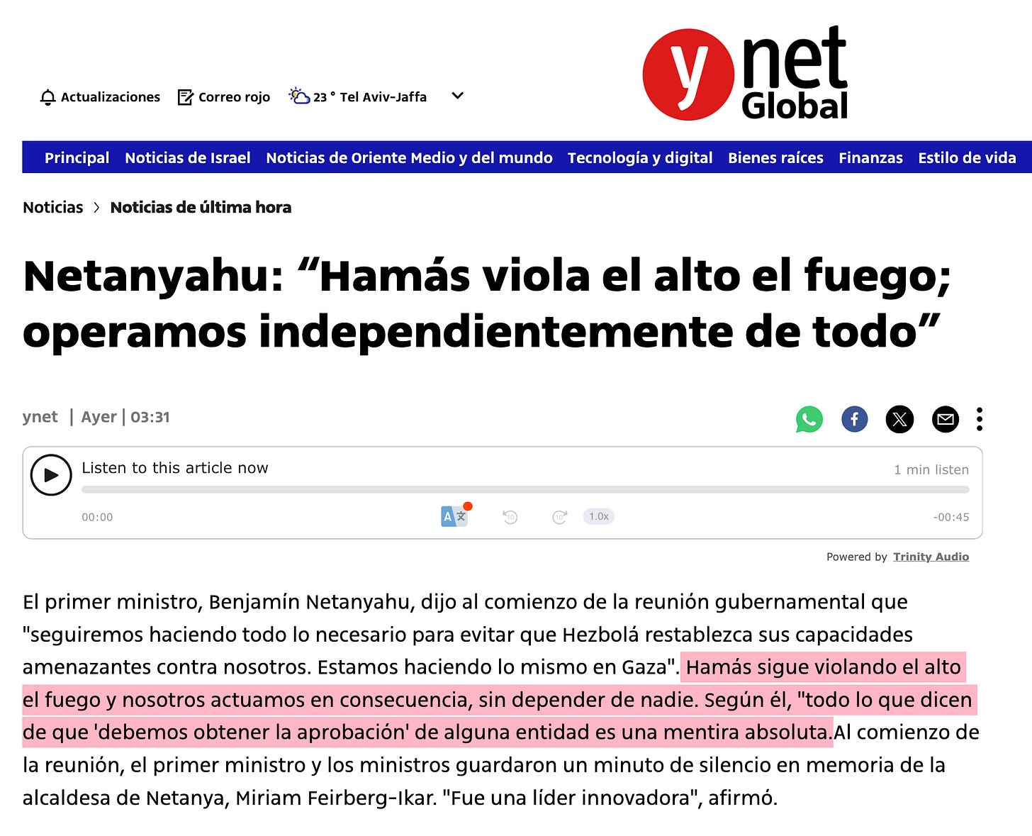 En cualquier caso, Israel se reserva y ejerce a discreción el derecho a disparar “sin depender de nadie ni obtener aprobación”, como dijo Netanyahu. El plan de Donald Trump autoriza a las tropas israelíes a seguir ocupando el 53% de Gaza hasta que Tel Aviv se dé por satisfecho con el cumplimiento palestino, lo cual es improbable que ocurra.