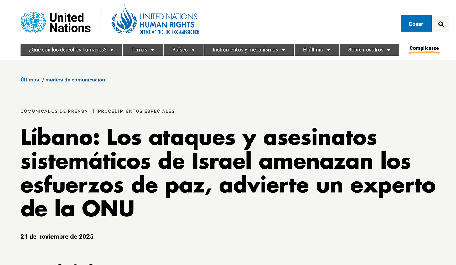 La ONU ha documentado casi 10 mil violaciones israelíes a la tregua, incluyendo ataques sistemáticos que amenazan la paz. El Relator Especial de las Naciones Unidas sobre ejecuciones extrajudiciales, sumarias o arbitrarias, Morris Tidball-Binz, condenó ataques letales en áreas pobladas, como el que este 18 de noviembre mató a 12 niños y dos adultos en el campamento de refugiados palestinos de Ein el-Hilweh.
