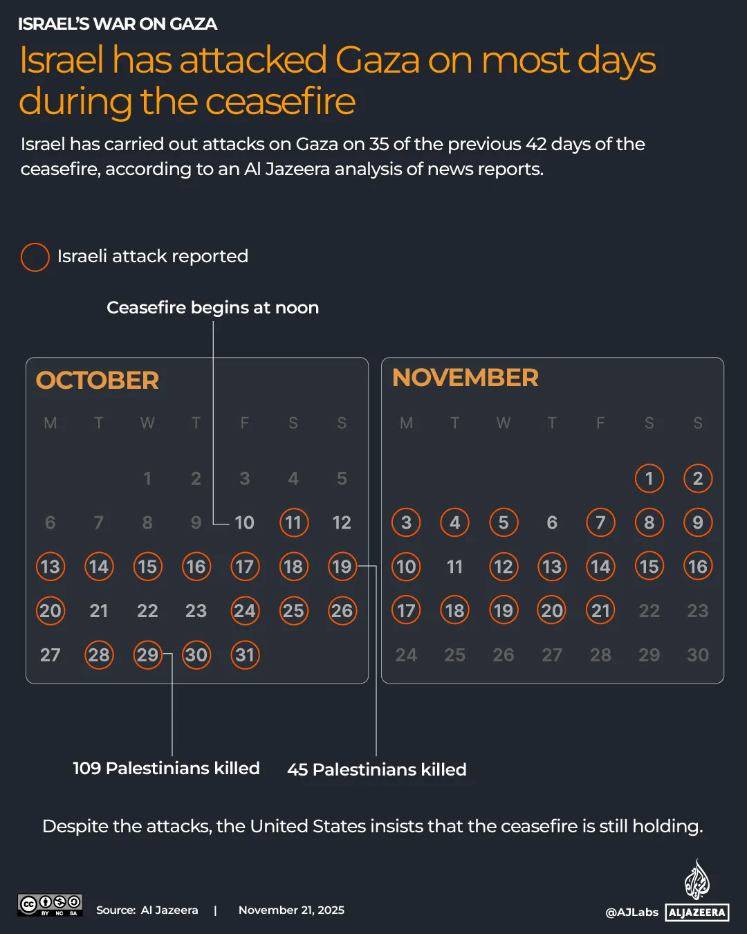 Según la Oficina de Medios de Gaza, Israel violó el acuerdo de alto el fuego al menos 393 veces entre el 10 de octubre y el 20 de noviembre: