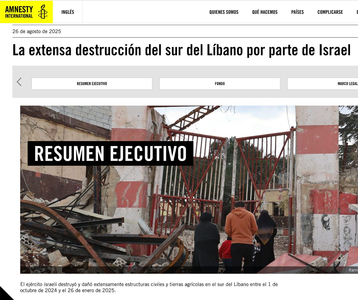 Y entre otras denuncias documentadas, Amnistía Internacional informó que Israel lleva a cabo una destrucción extensiva de infraestructuras civiles y tierras agrícolas en el sur de Líbano.