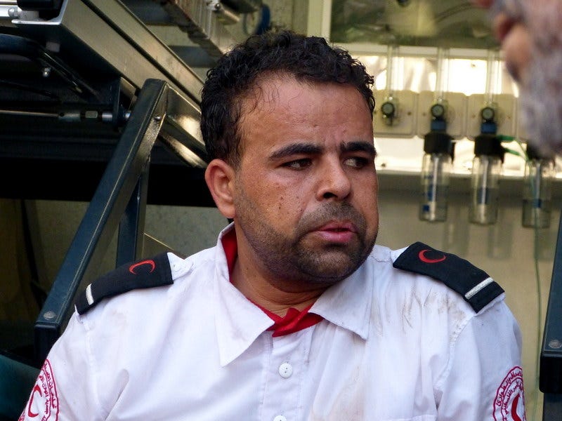 Demoramos un poco en movernos. Ya estábamos en el vehículo cuando le avisaron a un colega gazatí que había sido un doble ataque. El segundo había barrido con los primeros rescatistas que habían llegado. Poco antes de llegar al sitio, nuestro conductor recibió un mensaje y detuvo el carro en seco: habían vuelto a abrir fuego. Esta vez, contra los paramédicos y periodistas que alcanzaron a llegar. Sin preguntarnos, el chofer consideró que podía haber más tiros y optó por dirigirse al hospital Al Shifa.