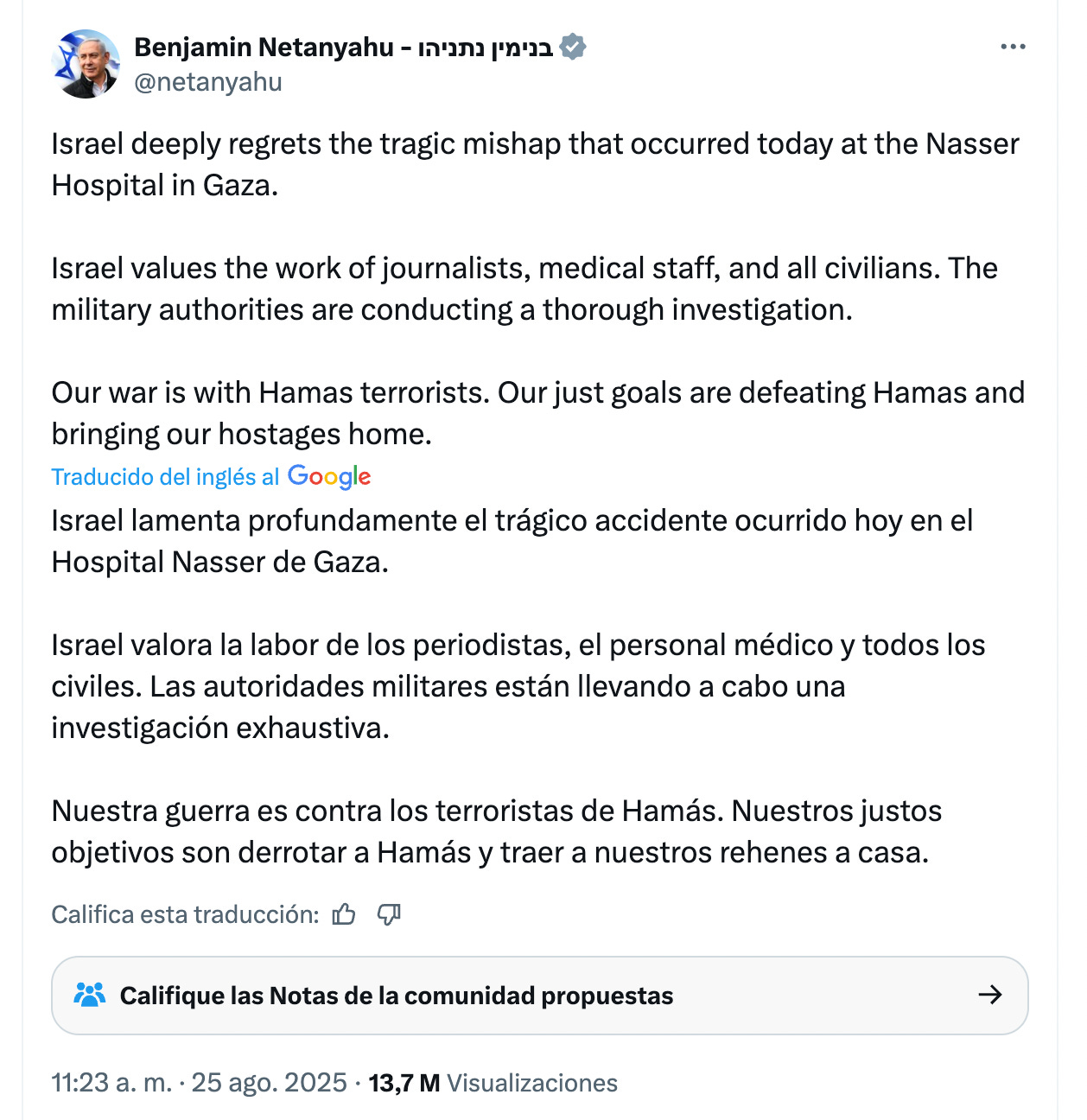 “Israel lamenta profundamente el trágico accidente ocurrido hoy en el Hospital Nasser de Gaza. Israel valora la labor de los periodistas, el personal médico y todos los civiles. Las autoridades militares están llevando a cabo una investigación exhaustiva”: esa fue la declaración que tuiteó el primer ministro Netanyahu.