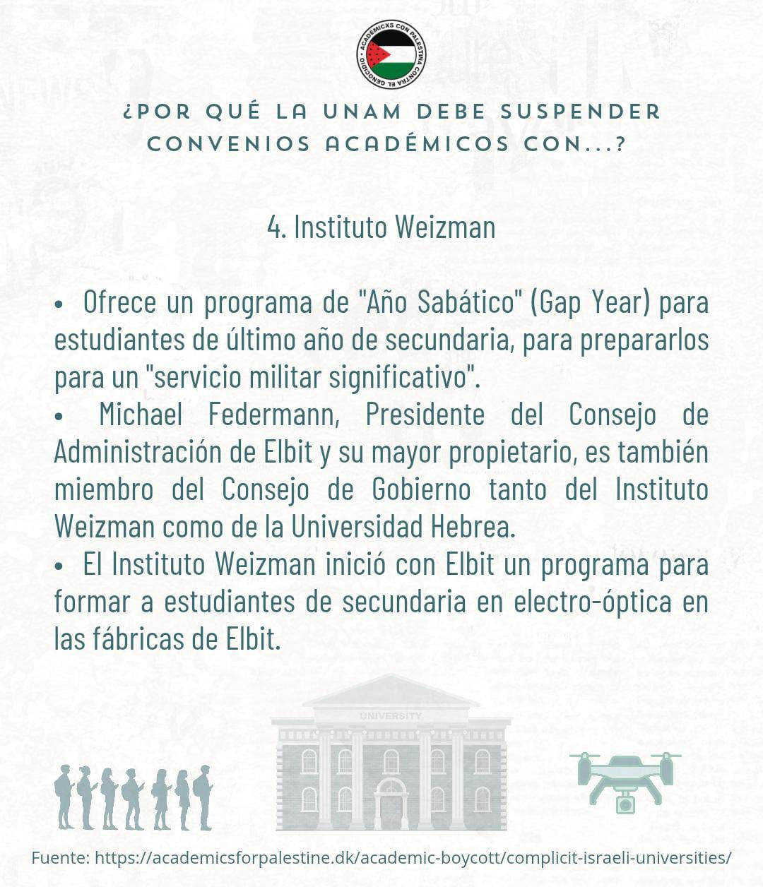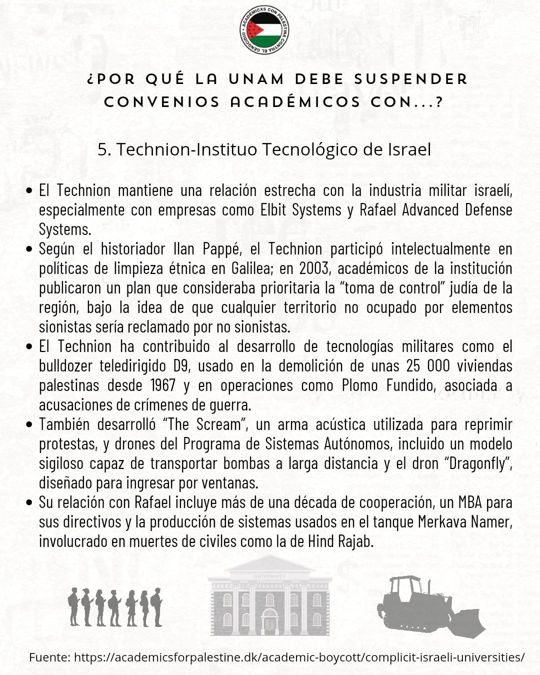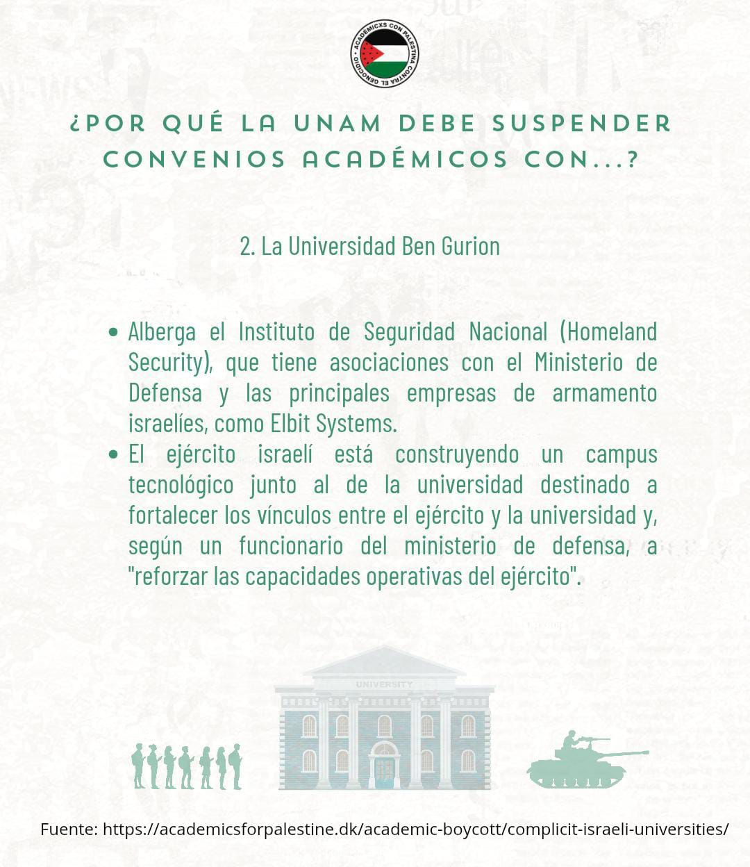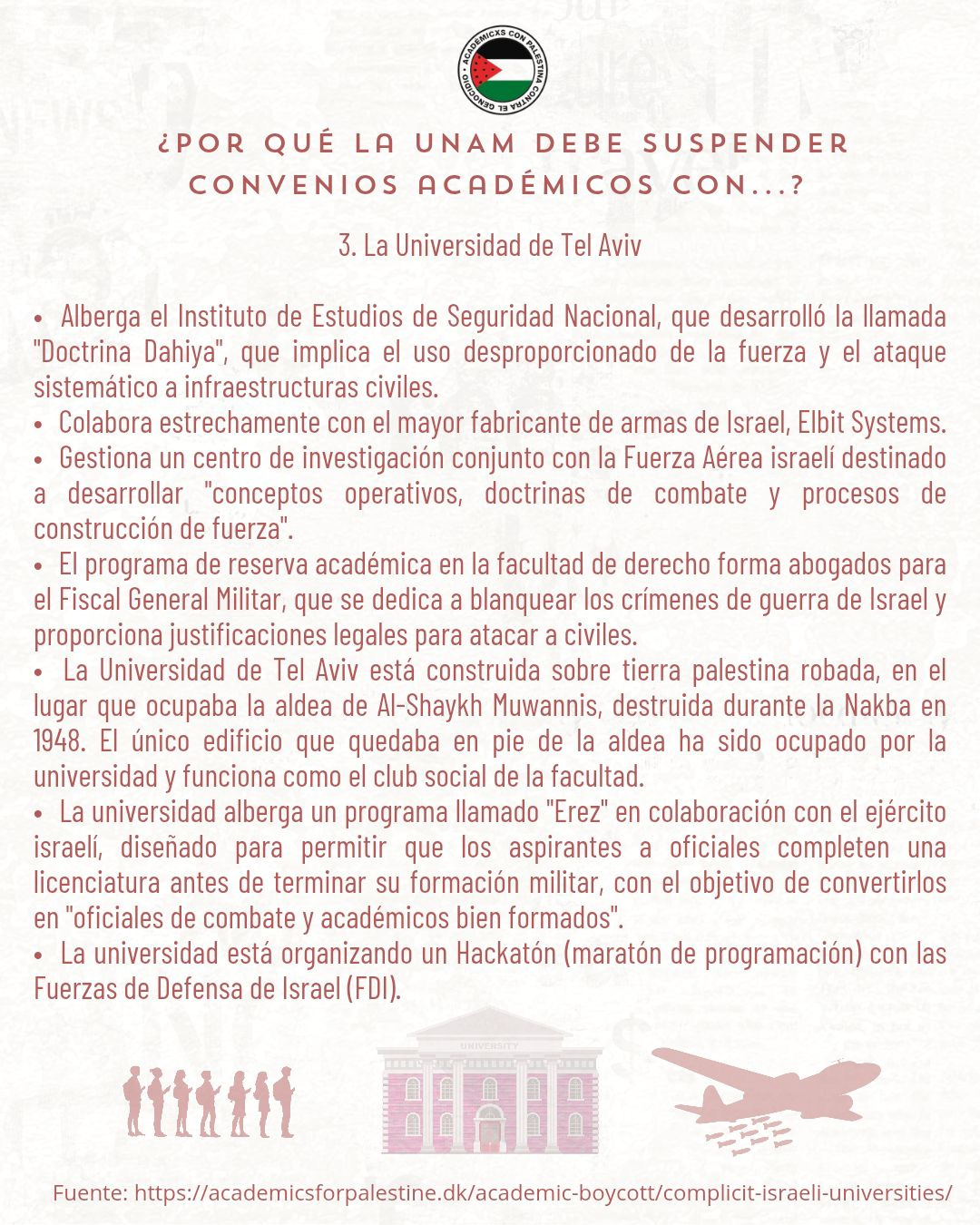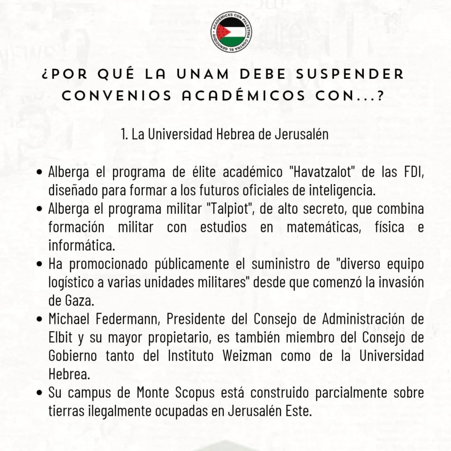“si dichos acuerdos no siguen vigentes, como lo asegura el Rector, confiamos en que la Universidad Nacional Autónoma de México no tendrá mayor problema para declarar públicamente su intención de no renovarlos ni celebrar nuevos convenios, tal como lo han hecho más de 80 universidades en 18 países, y dejar de ser interlocutor de instituciones que tienen un rol activo en la política colonialista, segregacionista y genocida del Estado de Israel”.