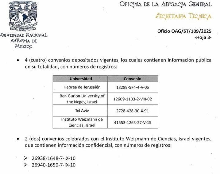 Un mes después, la organización recibió una respuesta parcial y además inexacta del secretario ejecutivo del mismo Consejo, quien aseguró que “después de un amplio análisis, se constató que la UNAM no cuenta con “ningún acuerdo de colaboración que implique movilidad académica” ni “proyectos vigentes de investigación con ninguna Universidad del Estado de Israel”.