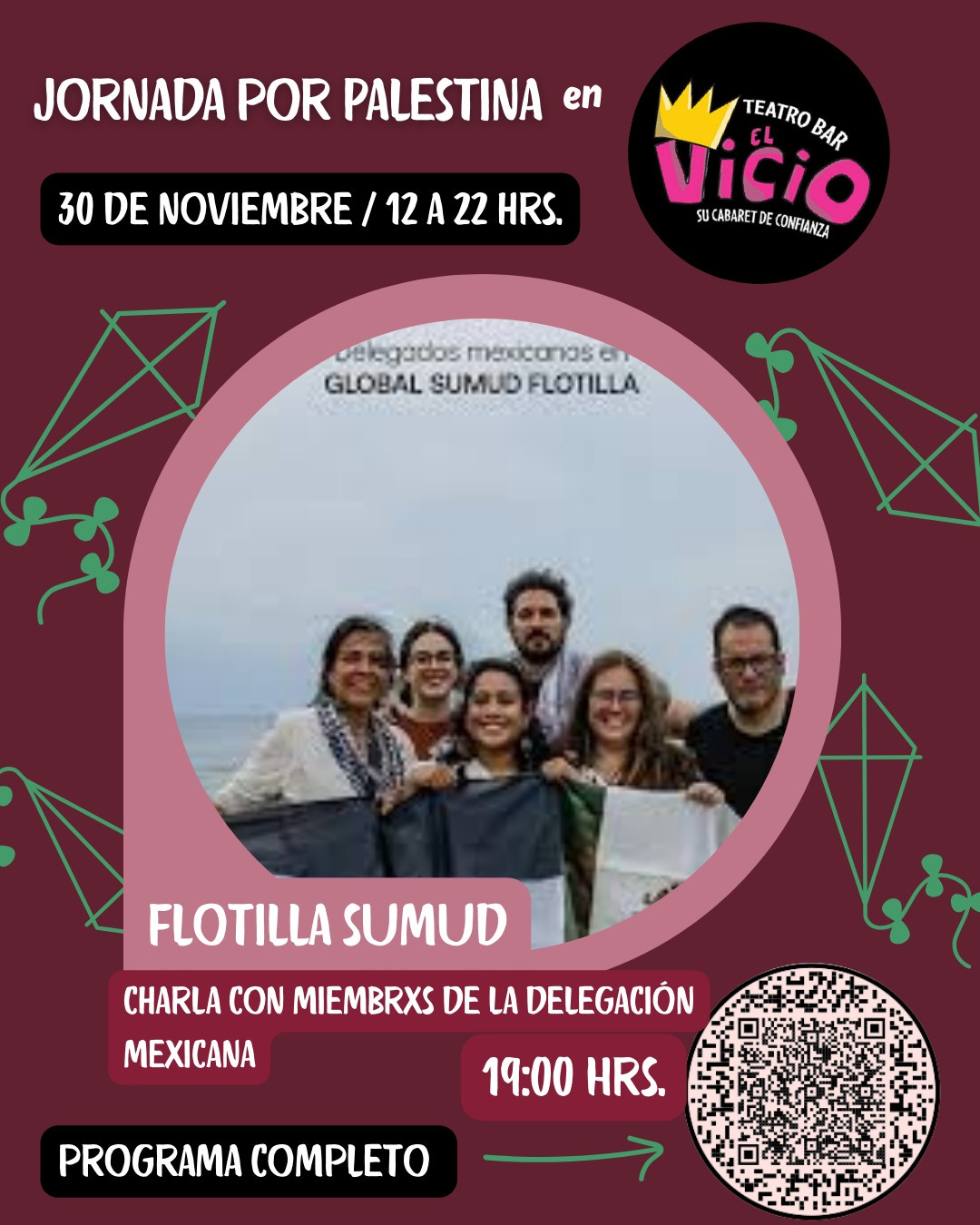 A las 19 horas, moderaré una charla de la Flotilla Global Sumud en la que estarán Sol González Eguía y Ernesto Ledesma, navegantes del Mediterráneo que sufrieron el secuestro por Israel, además de dos integrantes de la Flotilla de Tierra.